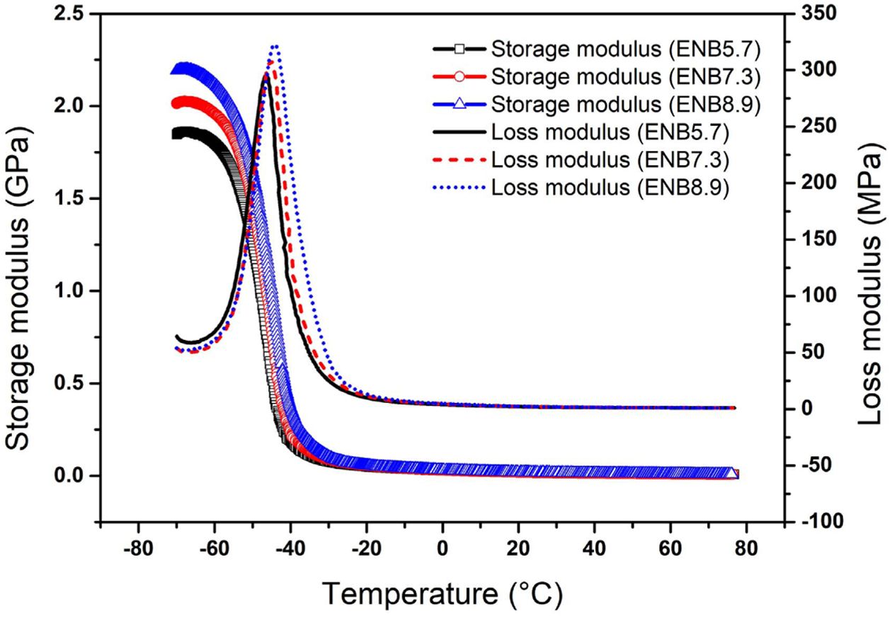 Fig. 3 Temperature-dependent storage and loss modulus curves of the EPDM/PP TPV with three different ENB content |