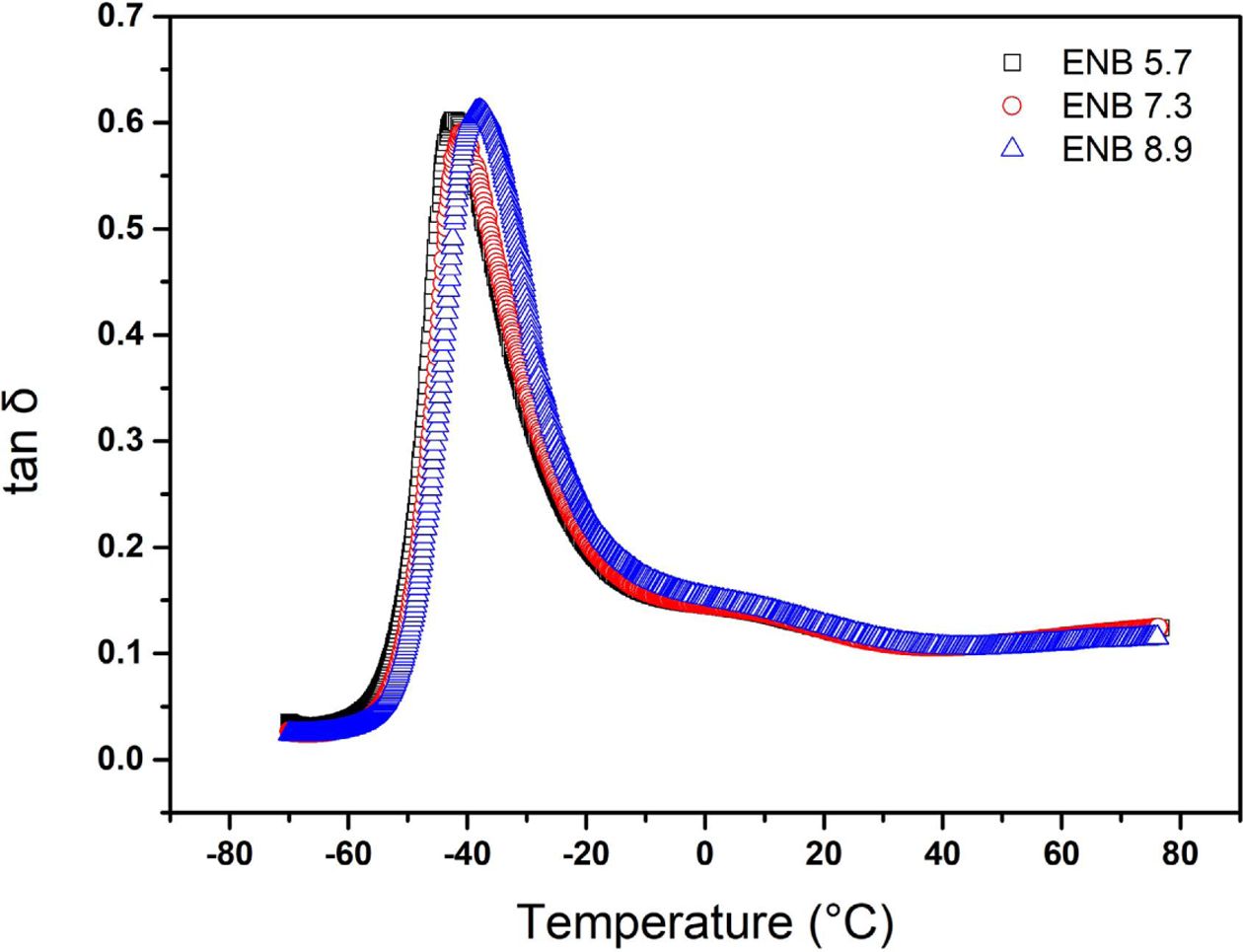 Fig. 4 Temperature-dependent tanδ curves of the EPDM/PP TPV with three different ENB content |