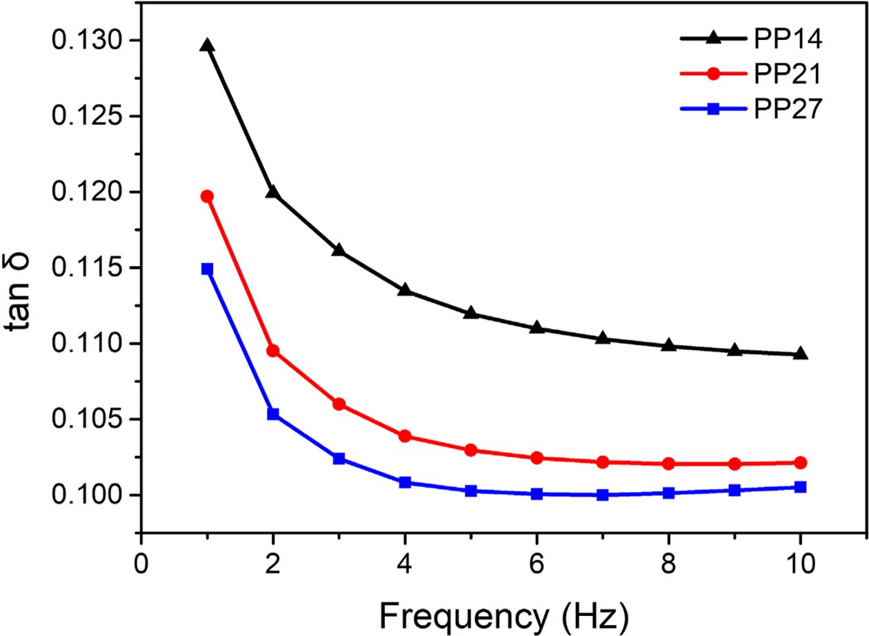 손실탄성률의 peak는 PP 비율이 낮을수록 높은 값을 보였으나(PP14 (288 MPa) 대비 PP27 (267 MPa) 7.3% 감소), -20~0oC에서는 PP 비율이 높을수록 높은 값을 나타내었다. Temperature-ramp test의 손실탄성률 그래프에서 peak는 EPDM의 유리전이(glass transition)을 나타내며, -20~0oC는 PP의 유리전이를 의미한다. 따라서 각각의 유리전이 영역에서 단위부피당 유리전이 되는 EPDM 또는 PP 양의 증가로 인해 내부 chain 간 미끄러짐에 의한 마찰 에너지 손실이 커져 손실탄성률이 증가한 것으로 판단된다.