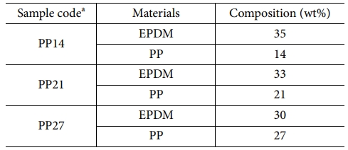 EPDM/PP의 비율의 영향을 분석하기 위해 Table 1과 같이 3가지 비율로 배합하였다. EPDM/PP의 비율에 따른 세가지 샘플 PP14, PP21, PP27은 각각 Shore A 경도 60, 70, 80을 의미하며, 기존 소재(PP27)의 EPDM/PP 비율(EPDM/PP 30/27)을 기준으로 PP의 비율을 낮춘 것이다.