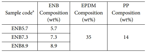 ENB는 EPDM monomer의 구성성분인 diene의 일종으로, 가교제와 반응하여 가교를 형성하게 된다. 본 연구에서는 ENB 함량에 따른 가교도 변화의 영향을 분석하기 위해 Table 2와 같이 배합을 진행하였다.