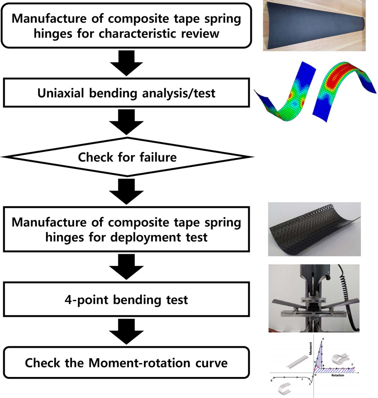 본 연구에서는 복합재료 테이프 스프링을 국내에서 시판되는 소재를 이용해서 개발하여 전개구조물로의 활용 가능성을 Fig. 1과 같이 검토하도록 한다. 이를 위해서 기본 특성검토용 테이프 스프링을 단방향 복합재료(UD, unidirectional composite), 직물 복합재료(Woven fabric composite)으로 여러 적층각을 고려해서 제작한다. 구조해석과 간단한 굽힘 시험을 통해 제작 가능성 여부를 검토하고 도출한 최적의 소재와 적층각을 찾는다. 3장에서는 2장에서 얻어진 소재와 적층각 정보를 이용해 시편을 제작하고 4점 굽힘 시험을 통해 모멘트-회전 특성커브 측정하여 확인한다. 모멘트-회전 특성커브에서 비선형성과 히스테리시스를 통해 테이프 스프링의 고유 특성을 보유하고 있는지 확인하고 개발 성공 여부를 판단한다.