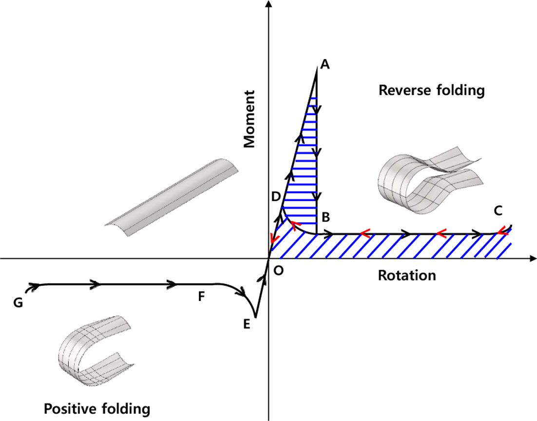 테이프 스프링은 앞서 언급하였듯이 굽힘모멘트에 의한 회전 거동에 관해서 비선형 히스테리시스 거동을 보여준다. Fig. 2는 테이프 스프링의 특성을 나타내는 굽힘모멘트-회전 프로파일로 역방향 굽힘(reverse folding)의 경우 굽혀질 때 O-D-A-B-C를 따라가지만 펴질 때는 C-B-D-0의 경로로 원상복구되며 이때 ABD로 둘러싸인 면적은 에너지 소산을 의미한다. 즉 굽힘모멘트의 경로가 작동 방향에 따라 변하며 고유의 비선형 히스테리시스 현상이 구현되는 것을 확인할 수 있다[3].