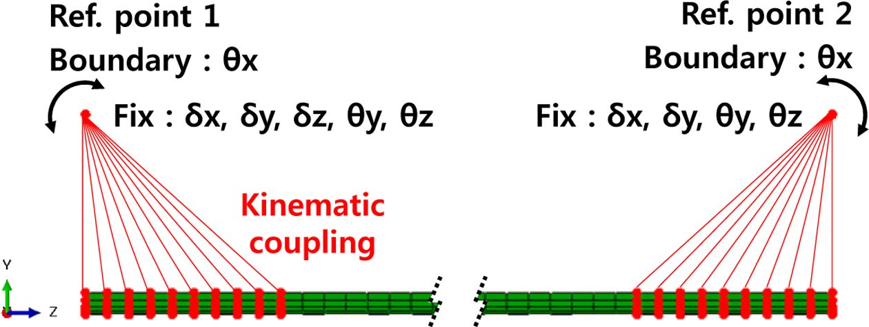 굽힘 하중에서의 복합재료 테이프 스프링의 파손 여부 및 특성을 검증하기 위해 1축 굽힘 해석을 수행하였다. 복합재료 테이프 스프링 모델의 정보는 Table 2 및 Fig. 3과 같다. 해석 케이스는 복합재료 종류와 적층 각도에 따라 Table 3과 같이 설정하였다. 1축 굽힘 해석은 ABAQUS/Explicit을 사용하여 Fig. 4와 같이 테이프 스프링 끝단의 절점을 각각 1번 기준점(Ref. point 1)과 2번 기준점(Ref. point 2)에 Kinematic coupling으로 연결한다. 그리고 기준점 1은 5개의 자유도(δx, δy, δz, θy, θz), 기준점 2는 4개(δx, δy, θy, θz)의 자유도를 구속하고 각 기준점의 x축 회전 자유도(θx)에 회전값을 적용하여 Fig. 5와 같이 정방향(Positive direction), 역방향(Reverse direction) 굽힘 해석을 수행하였다.