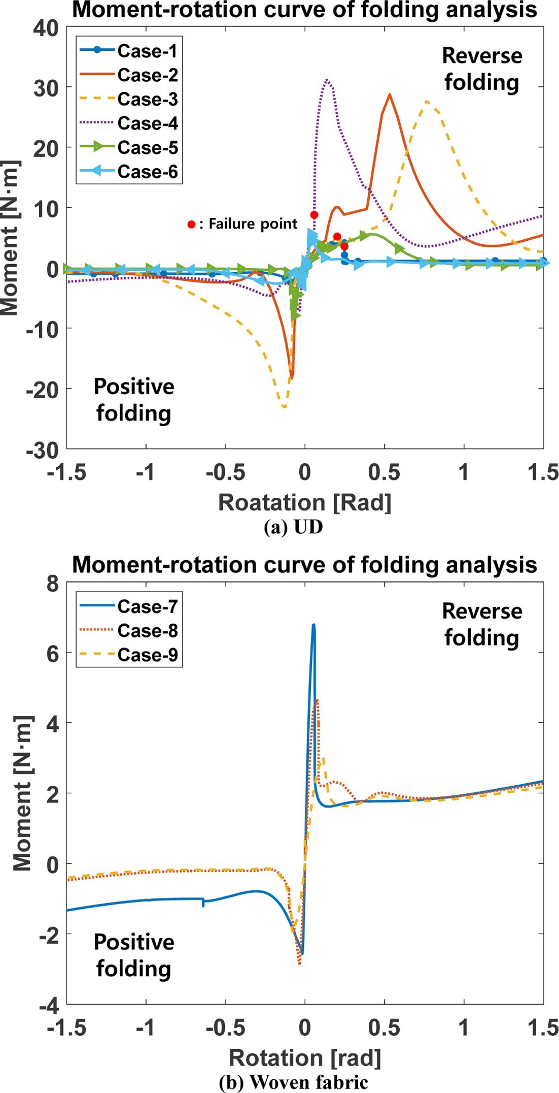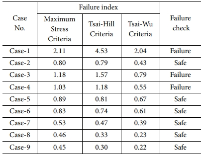 굽힘 해석에서 단방향 복합재료 모델의 해석 결과는 Fig. 6a와 같이 모멘트-회전 곡선에 snap-through 좌굴에 의한 첨점의 위치가 일정하게 발생하지 않고 나타났다. 반면에 직물 복합재료 모델의 해석 결과에서는 모멘트-회전 곡선의 첨점이 대략 일정하게 나타나는 특성을 확인하였다. 최대 응력이 발생하는 역방향 굽힘 해석에서 첨점에서 최대 응력을 산출하여 최대 응력 이론, Tsai-Hill, Tsai-Wu 파손 이론을 적용하여 Table 4와 같이 파손 여부를 판단하였다. 파손 이론을 적용한 결과, 직물 복합재료 해석 모델의 파손 지수가 모두 1보다 낮았다. 하지만 단방향 복합재료 해석 모델은 6개의 케이스 중 3개의 파손 지수가 1보다 높아 파손 가능성이 높음을 확인하였다.
