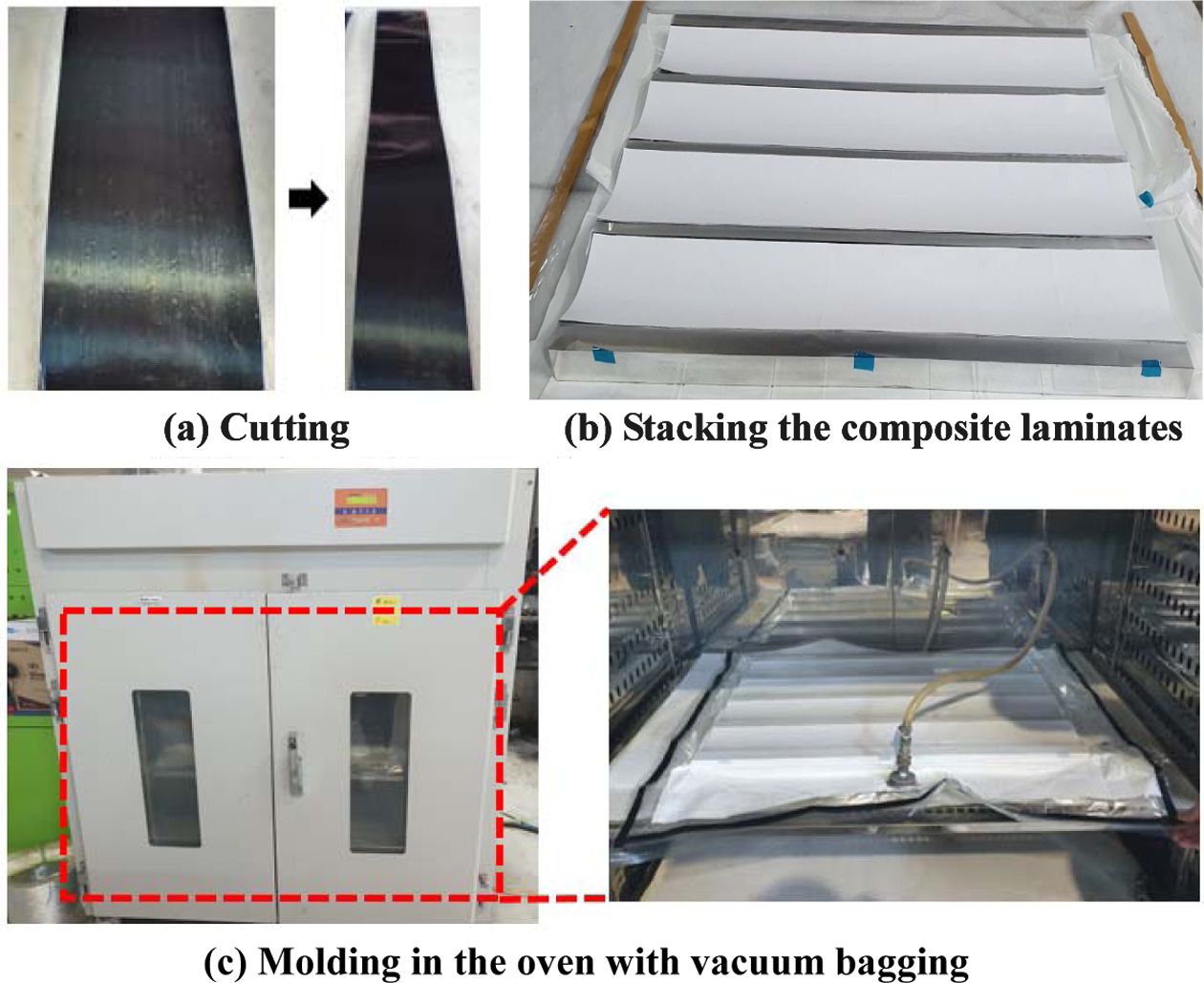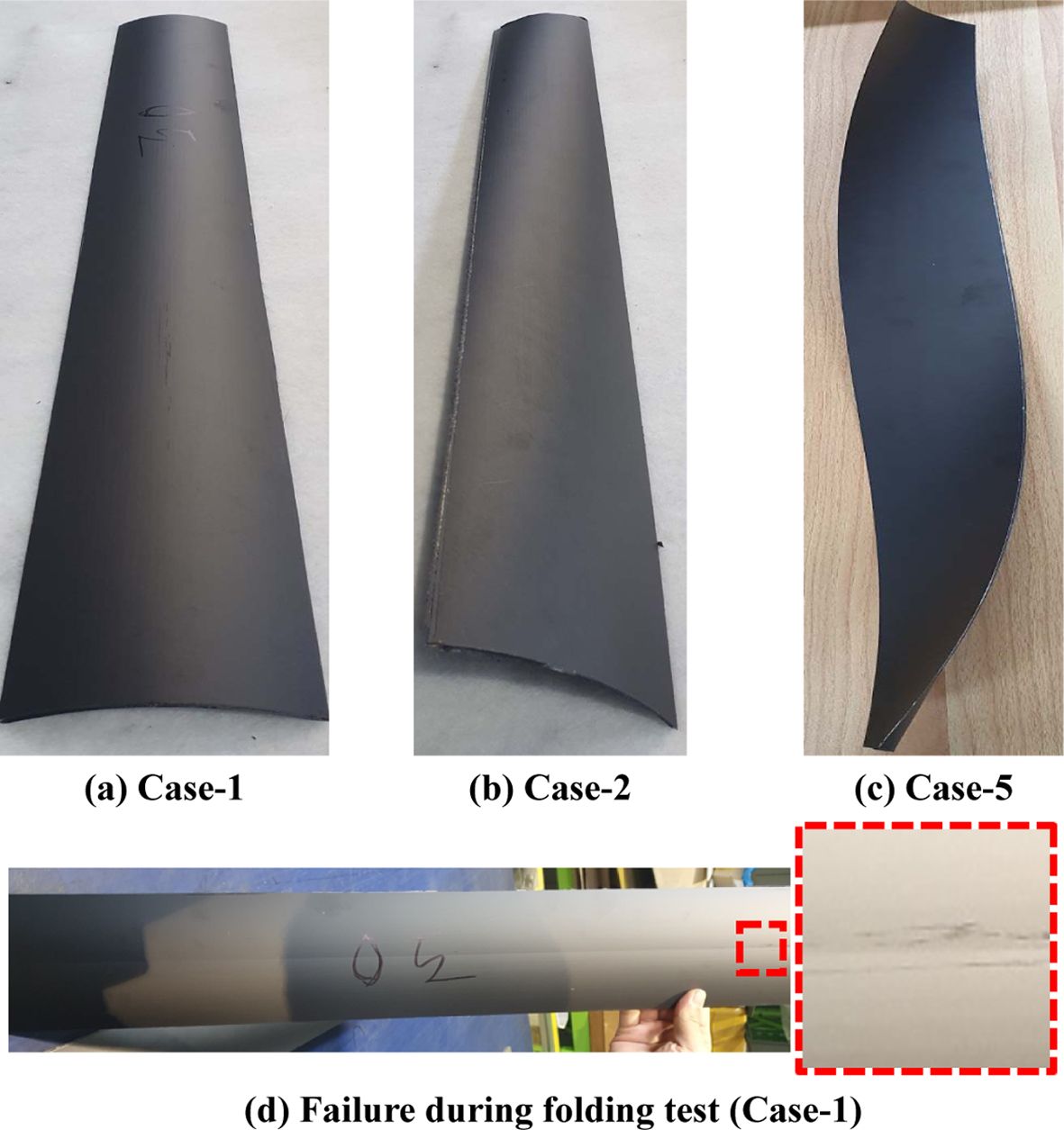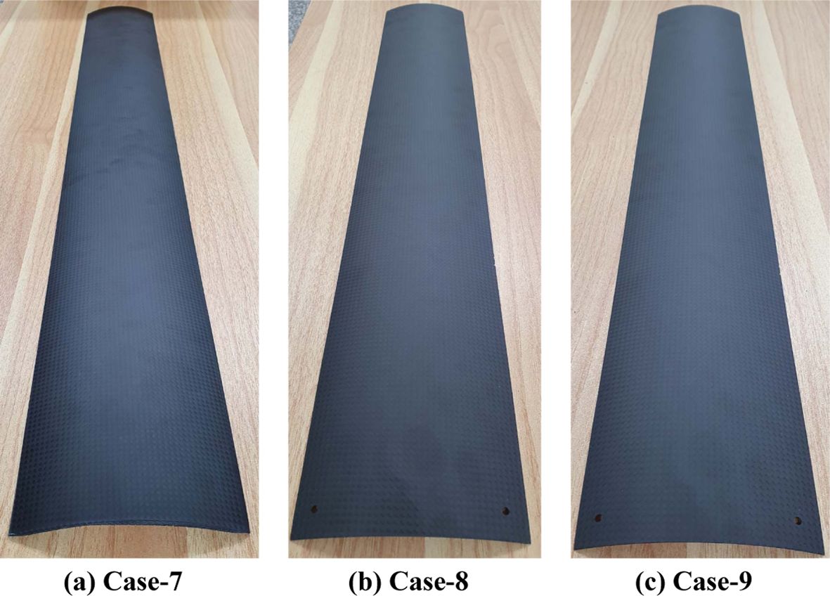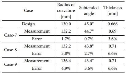 본 연구에서는 복합재료 테이프 스프링의 굽힘 거동 특성을 확인하기 위해 복합재료 테이프 스프링을 제작하였다. 우선 복합재료 테이프 스프링의 치수에 맞게 알루미늄 몰드를 제작하고 Fig. 7과 같은 과정을 통해 복합재료 테이프 스프링을 제작한다. 이때 경화 조건은 각 복합재료의 제조사에서 제공하는 온도, 압력으로 설정하였다[21,22]. Table 3에 나타난 모든 해석의 경우를 제작하였다. 제작 결과 단방향 복합재료로 제작한 경우 적층 각도가 0°인 Case-1은 Fig. 8a와 같이 설계 형상과 유사하게 제작되었지만, Case-2~Case-4의 경우 성형 과정에서 발생하는 적층 각도의 미세한 편차에 의해 Fig. 8b와 같이 뒤틀림이 발생하였다. 또한, Case-5와 Case-6은 적층된 복합재료가 상∙하부 적층 각도의 균형이 잡히지 않아 Fig. 8c와 같이 복합재료가 크게 뒤틀렸다. Case-1의 경우에도 굽힘 시험을 수행한 결과 Fig. 8d와 같이 중간이 갈라지면서 파손이 발생하였다. 반면 직물 복합재료는 준등방성 특성이 있어 Fig. 9 및 Table 5와 같이 모두 설계 치수와 큰 오차 없이 제작되었으며 굽힘 테스트를 수행하였을 때 굽힘 후 전개가 적절히 일어남을 확인하였다.