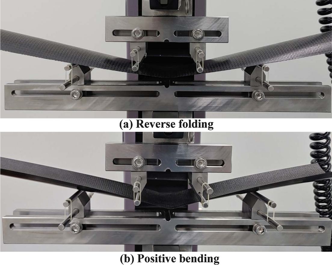 앞서 도출된 복합재료 테이프 스프링의 기계적 특성을 확인하기 위해 ASTM D6272의 규격에 맞춰 Fig. 10의 MTS사의 복합 시험기를 사용하여 Fig. 11과 같이 4점 굽힘 시험을 수행하였다. 4점 굽힘 시험 시편은 Table 6에 나타나듯이 전개 메커니즘으로 검증이 된 STS 테이프 스프링과 거의 같은 두께를 갖는 WSN 03KP[45]1인 복합재료 테이프 스프링을 사용하였다. 그리고 곡률반지름과 굽힘모멘트의 관계를 나타내는 수식 (4)와 같이 같은 곡률반지름에서 STS 테이프 스프링과 유사한 굽힘모멘트를 갖는 복합재료 테이프 스프링을 설계하였다. 복합재료는 STS보다 탄성계수가 낮기 때문에 폭을 2배 늘려 관성모멘트를 증가시켰다. 4점 굽힘 시험은 정방향과 역방향으로 snap-through 좌굴이 발생할 때까지 하중과 변위를 측정하여 모멘트-회전 곡선으로 환산하였다.