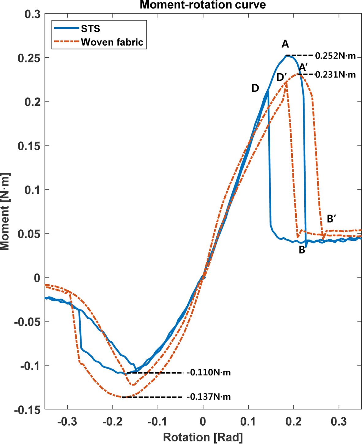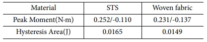 Fig. 12 Comparison of the moment-rotation relationship between STS and Woven fabric tape spring hinges |