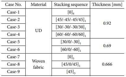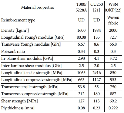 복합재료 테이프 스프링의 소재로 사용될 제조용 복합재료의 종류는 크게 단방향 복합재료, 직물 복합재료가 있다[18,19]. 본 연구에서는 국내에서 수급할 수 있고 복합재료 테이프 스프링 제작에 사용되었던 T300/5228A와 기계적 물성이 비슷한 복합재료를 Table 1과 같이 선정하였다[20-22]. 첫 번째 복합재료는 단방향 복합재료인 한국 카본의 CU250이고 두 번째는 직물 복합재료인 SK케미칼의 WSN 03KP이다.