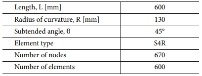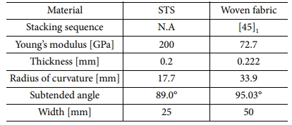 전개구조물에 적합한 복합재료 테이프 스프링 개발을 위해 복합재료 테이프 스프링의 전체 길이, 곡률 반경, 중심 내각, 두께와 같은 설계 변수를 이용해서 테이프 스프링을 설계하였다[17]. 여기서, 복합재료 테이프 스프링의 두께는 소재로 사용되는 복합재료의 종류와 적층수에 따라 결정된다.