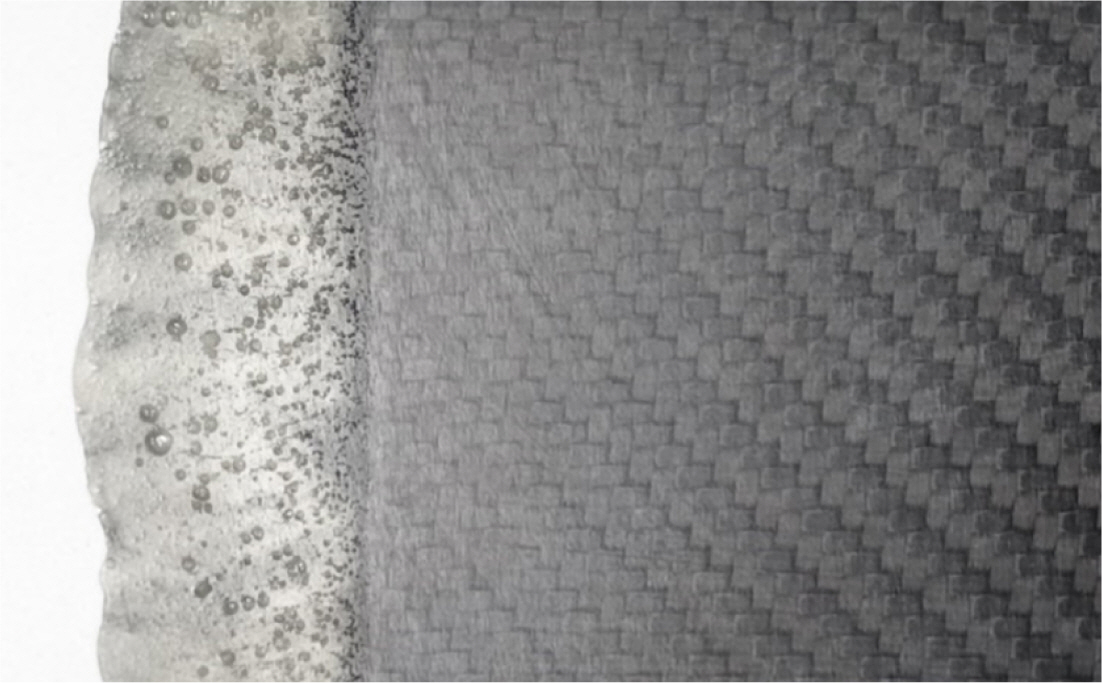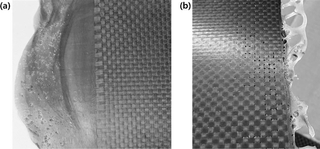 PCM 공정에서는 Fig. 1의 (a)와 같이 낮은 점도일 때 높은 압축압력이 가해져 다량의 수지가 빠져나오면서 직물의 형태가 변형되는 문제가 있으며 Fig. 1의 (b)와 같이 경화가 이미 진행된 후 프레스 압력이 늦게 가해지면서 표면 핀 홀과 다량의 Void가 제품 내부에 잔존하는 문제가 있다. 이 두 종류의 문제는 프레스의 압력, 온도, 시간을 바꿔가면서 여러 차례 시도해야 안정화가 가능하며 때로는 많은 시간과 노력이 필요하다.