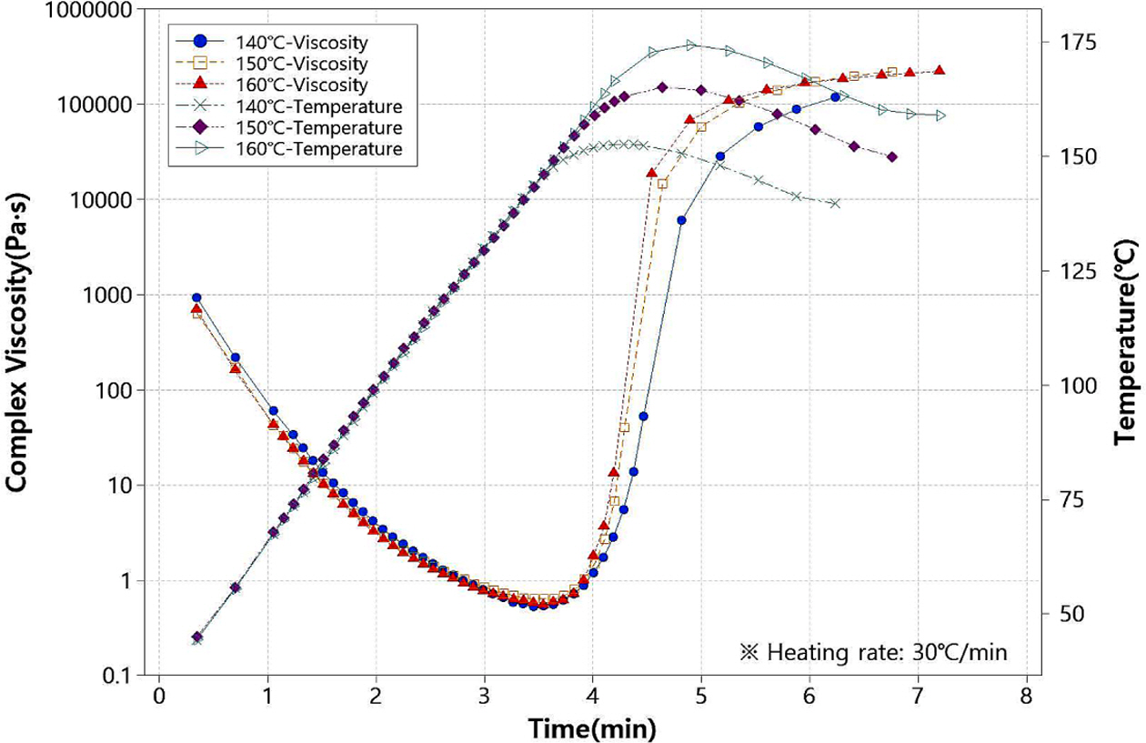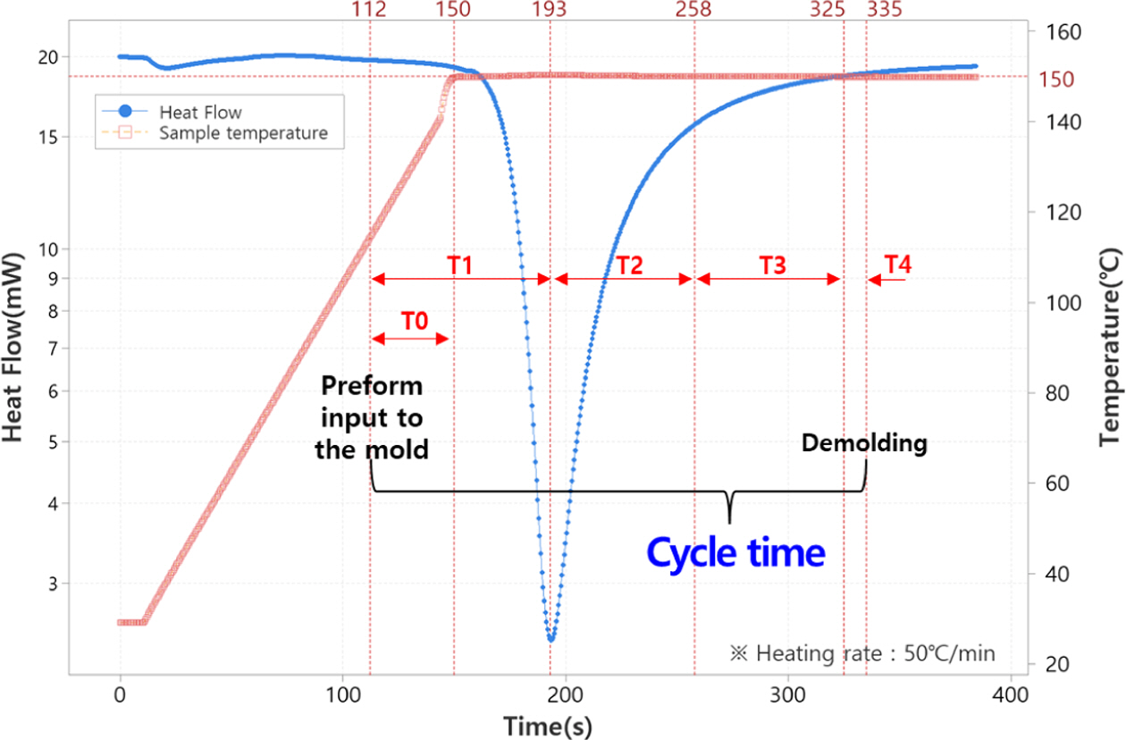 회전형 레오미터와 시차주사열량계는 가열된 상태에서 소재를 투입할 수 없기 때문에 금형이 가열된 상태에서 소재가 투입되는 본 연구의 공정과는 차이가 있다. 따라서 승온 속도를 최대로 해야 간극를 줄일 수 있는데 장비의 안정성 문제로 한계가 있었다. 그럼에도 DSC curve는 데이터의 밀도가 높고 150oC 도달 후 온도를 균일하게 유지하고 있어 공정 설정을 위한 기초 자료로 적합할 것으로 판단하였다. 따라서 DSC curve를 S/W에 활용하기로 결정하였다.