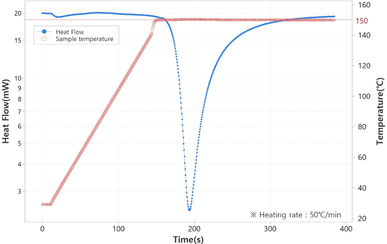 본 연구에서는 공정조건을 설정하기 위해 Fig. 2와 같이 회전형 레오미터를 이용하여 140oC, 150oC, 160oC의 온도에서 프리프레그의 경화거동을 분석하였다. 이 후 그래프 분석을 통해 사이클타임과 에너지 낭비를 최소화할 수 있는 150oC에서 성형하기로 결정하였다. 그리고 Fig. 3과 같이 시차주사열량계(DSC, Differential Scanning Calorimetry)를 이용하여 150oC의 등온조건으로 경화거동을 추가로 분석하였다.
