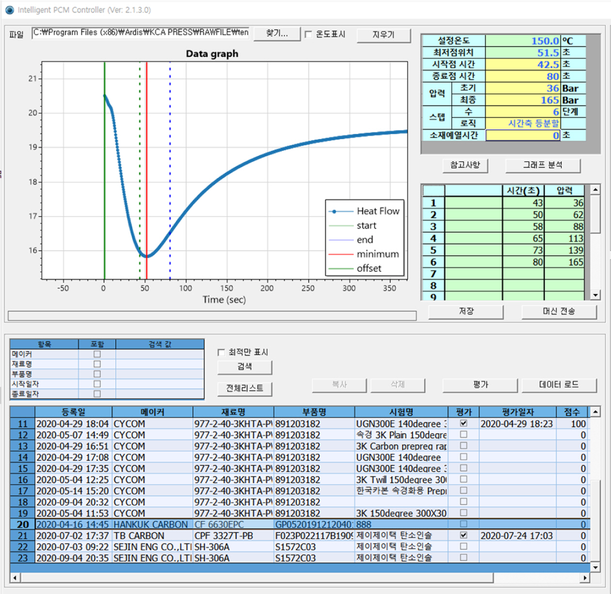 성형품질의 일관성을 유지하기 위해 Fig. 4와 같이 실험자가 설정한 공정조건대로 PCM 장비를 자동으로 구동 시킬 수 있는 S/W를 개발하였다. 입력화면에서 프레스 압력의 시작과 종료 시간, 초기압력과 최종압력, 스텝 수를 입력하면 XY축 등분할법 알고리즘에 의해 단계별 압력과 시간이 자동으로 분할된다. 그리고 이렇게 설정된 공정조건을 프레스에 전송하면 동일한 방법으로 계속 성형할 수 있다. 그리고 신속하게 다른 공정조건을 불러올 수도 있다.