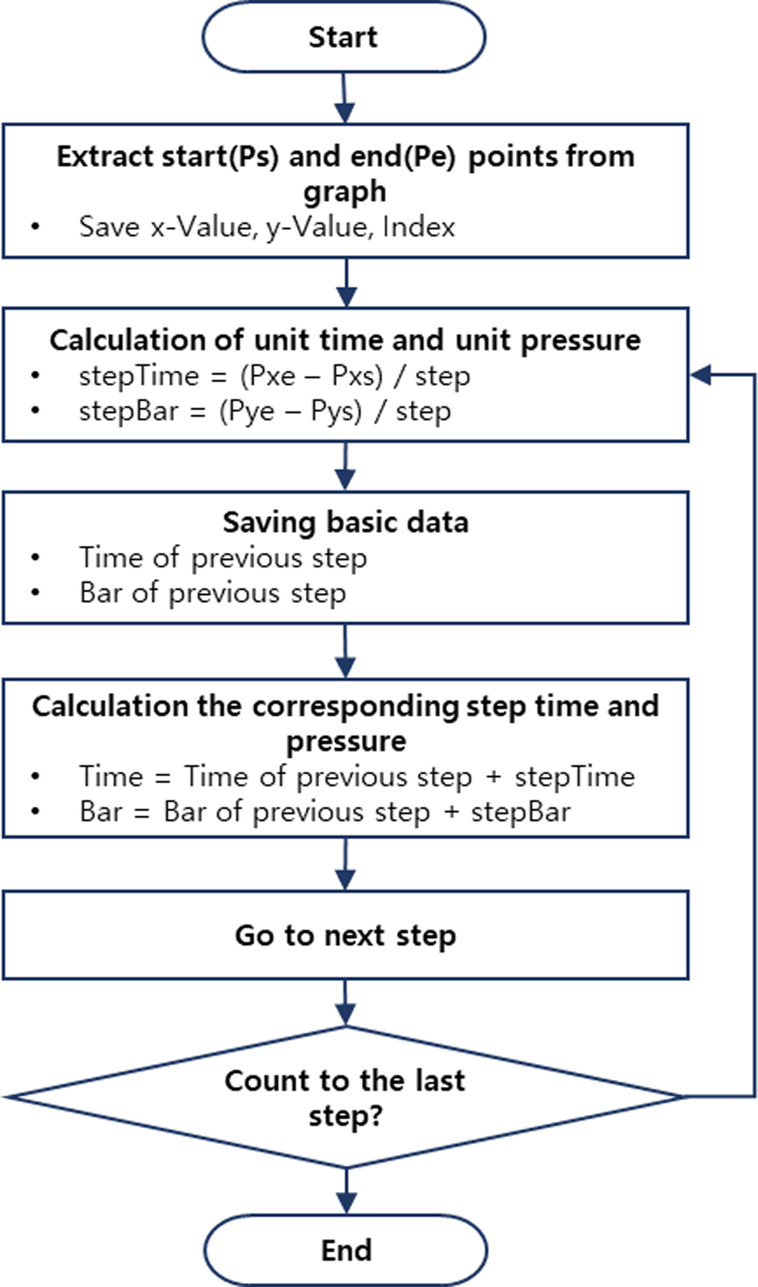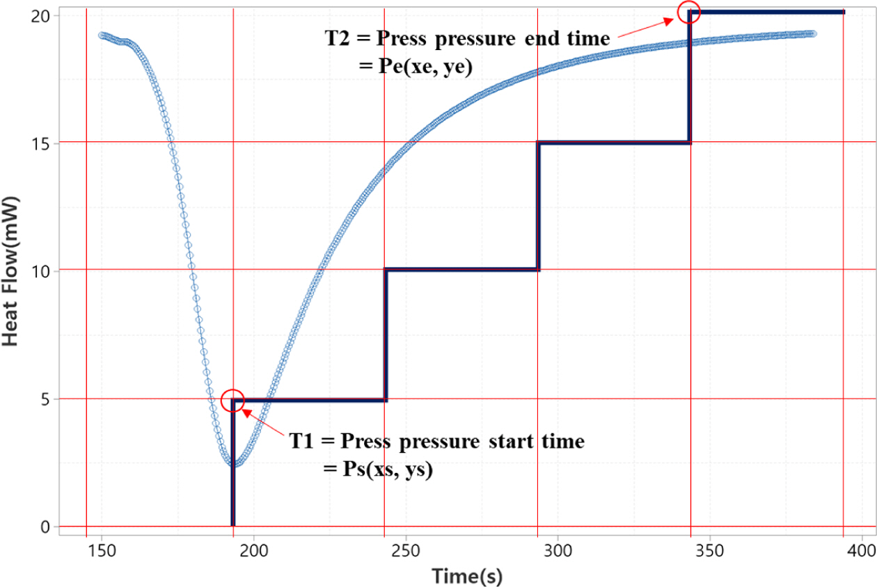Fig. 5는 XY축 등분할법을 설명하는 개요도로 DSC 그래프를 기준으로 프레스 압축압력의 시작점, 종료점 좌표 지정을 통해 자동으로 단계별로 압력과 시간이 분할되는 것을 설명한다. 즉 각 단계별로 시간과 압력의 변화를 동일하게 증가시키는 XY축 등분할법은 Fig. 6 알고리즘에 의해 S/W에서 자동으로 설정된다.
