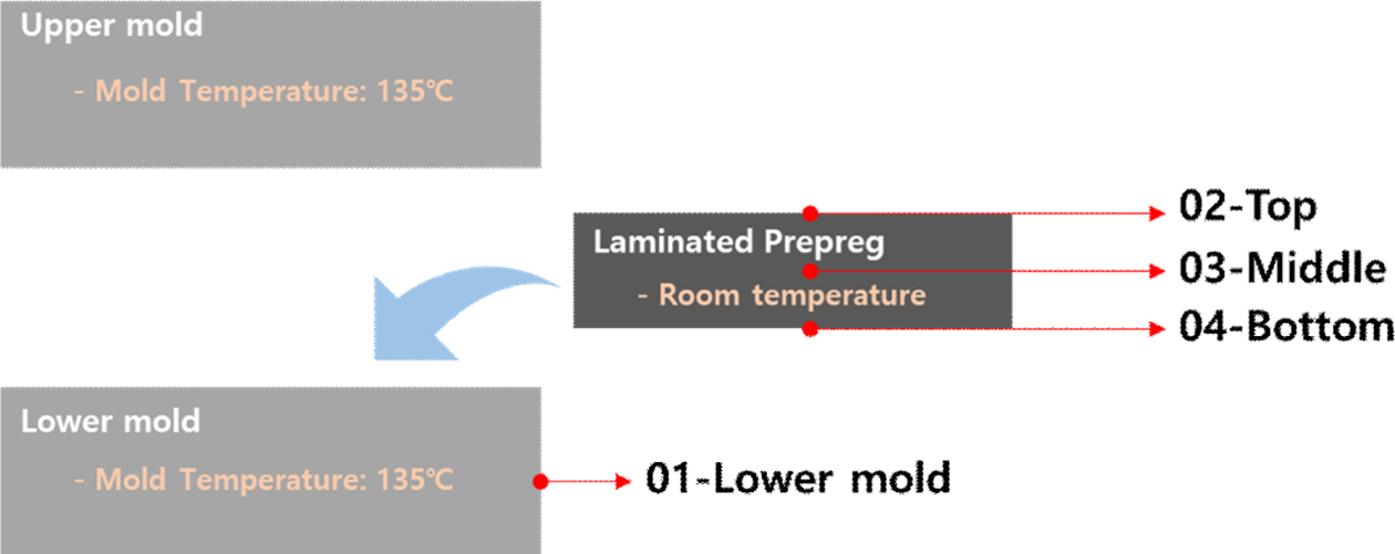적층된 프리프레그의 예열 시간은 Fig. 8와 같이 ‘T0, Prepreg preheating time’으로 결정하였다. T0는 Fig. 9의 압축압력 시작시간인 ‘T1, Compression start time’에 포함된다. 즉 예열과 성형이 한 공정에서 진행된다.