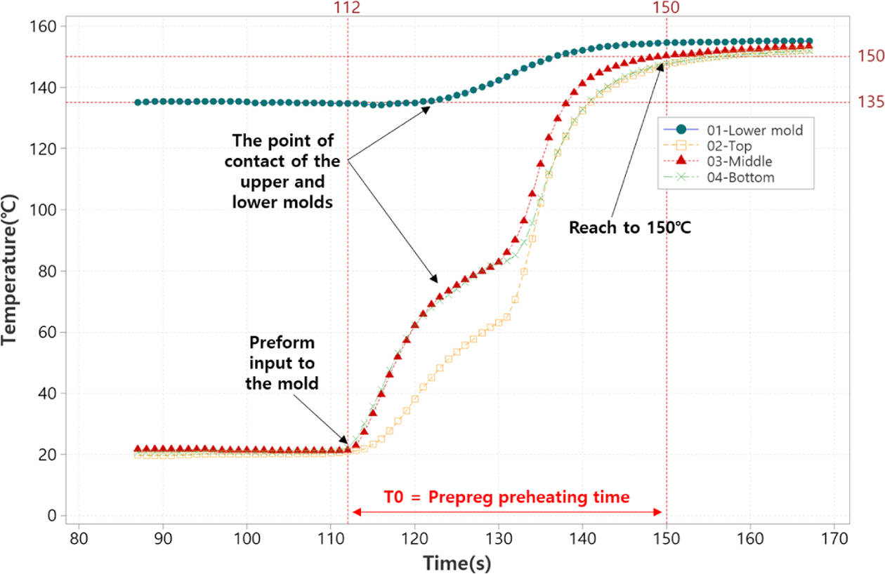 적층된 프리프레그를 금형에 투입한 후 150oC에 도달하기까지 걸리는 시간은 소재 예열시간(Prepreg preheating time)으로 본 연구에서는 매우 중요한 공정변수다. 따라서 Fig. 7과 같이 적층된 프리프레그를 금형에 투입한 후의 상황을 4개의 온도센서를 통해 정밀하게 관찰하였다. 이 때 금형이 열린 상태에서의 표면온도는 135oC를 유지하였다. 금형은 지속적으로 열을 방출하고 있기 때문에 금형을 닫게 되면 근접하는 금형의 표면온도가 급격히 상승한다. 따라서 금형 내부에 적층된 프리프레그를 투입한 후 금형을 닫았을 때 약 38초가 지나면 4개의 온도센서 모두 150oC에 도달하는 것을 Fig. 8 그래프를 통해 확인할 수 있었다. 예열시간의 주요변수로는 Press stroke 길이, 프레스의 하강 속도, 적층된 프리프레그의 두께가 있다.