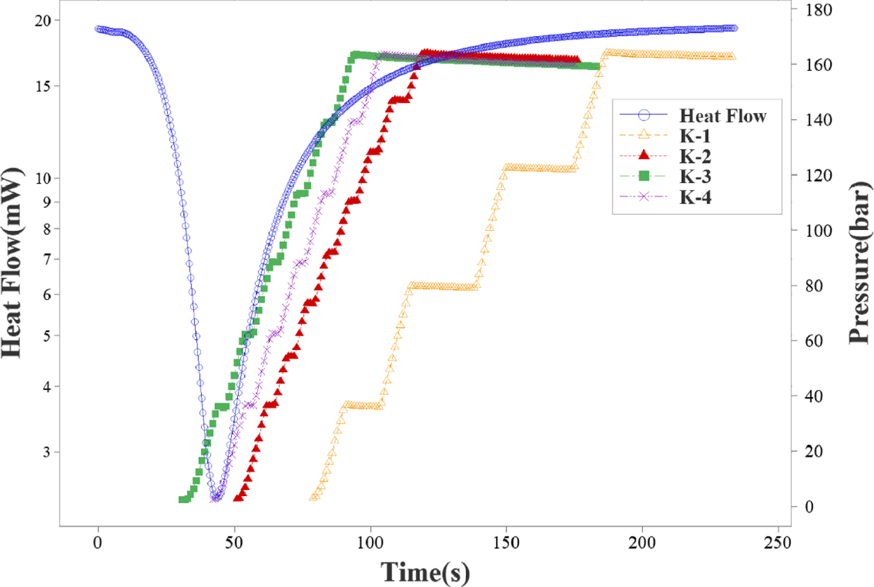 Fig. 10은 PCM 장비에서 각 샘플의 성형 중 기록된 압축압력 변화 그래프이다. 여기서 K-1 샘플의 경우 경화가 이미 진행된 후 압력이 늦게 가해져 Fig. 11의 (a)와 같이 다량의 Void가 생성되었고, 이 Void로 인해 압축강도는 239 MPa로 상당히 낮게 나타났다.