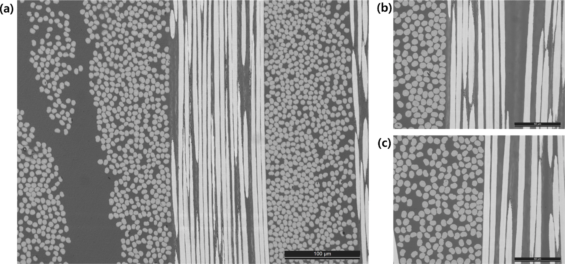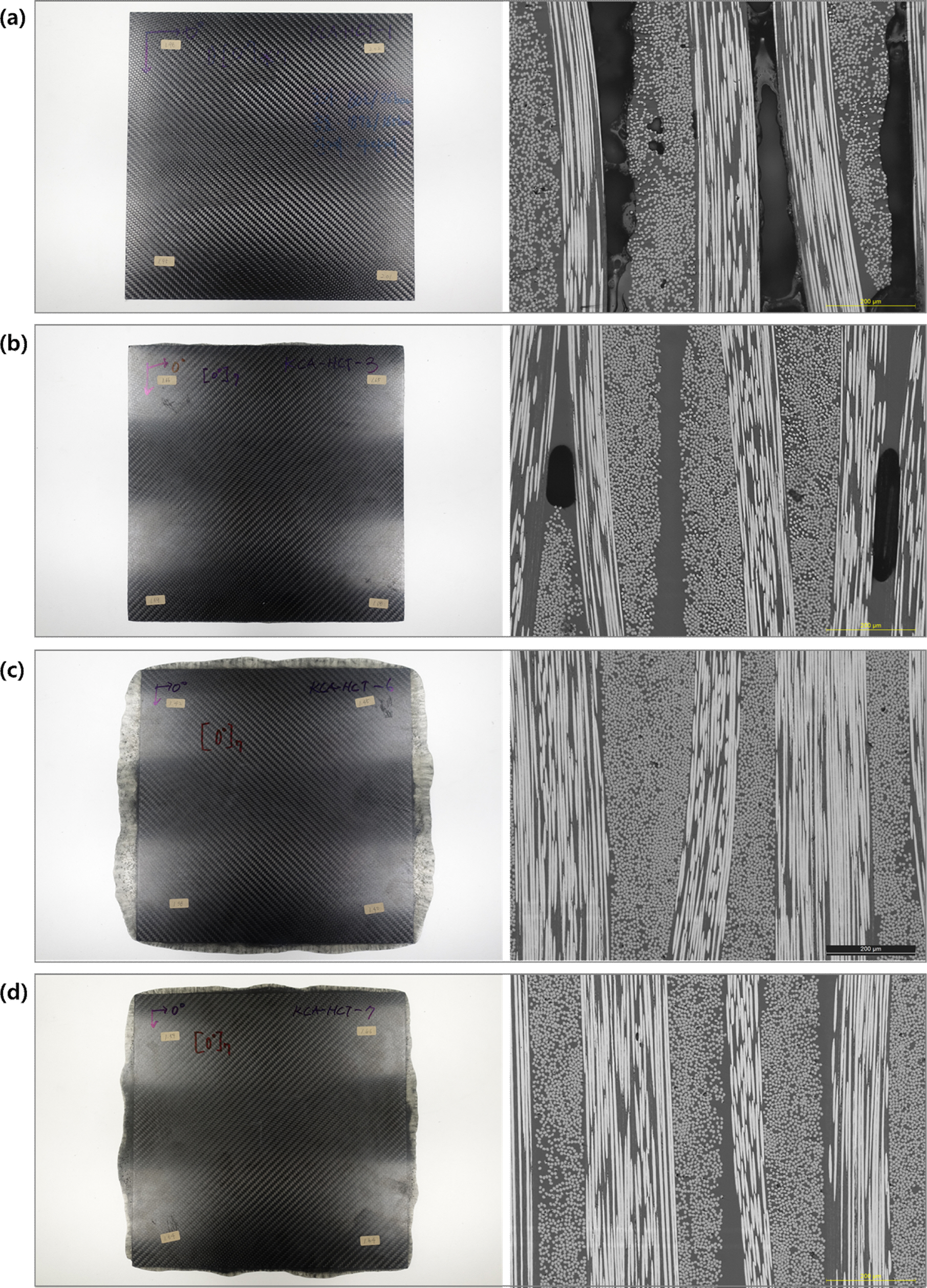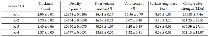 K-2 샘플은 열량축 최저점의 약간 우측에서 프레스 압력이 시작되었다. 압축강도는 약 521 MPa이며 두께는 약 1.7 mm로 나타났다. Fig. 11의 (b) 이미지는 K-2 샘플의 촬영 사진으로 Void가 산발적으로 생성된 것이 확인되었다. Fig. 11의 (c) 이미지는 K-3 샘플의 단면촬영 사진으로 Void가 관찰되지 않았다. K-3 샘플의 압축강도는 약 606 MPa, 섬유부피분율은 평균 50.59%로 4개의 샘플중에서 가장 높은 값이다. 두께는 약 1.4 mm로 가장 낮게 나타났다. Fig. 11의 (d)는 K-4 샘플의 촬영 사진이며 Void가 관찰되지 않았다. K-4 샘플은 열량축 최저점에서 압축압력이 시작되었으며 압축강도는 약 561 MPa, 섬유부피분율은 평균 48.92%로 나타났다. 각 샘플의 구체적인 기계적 물성 값은 Table 2에서 확인할 수 있다.