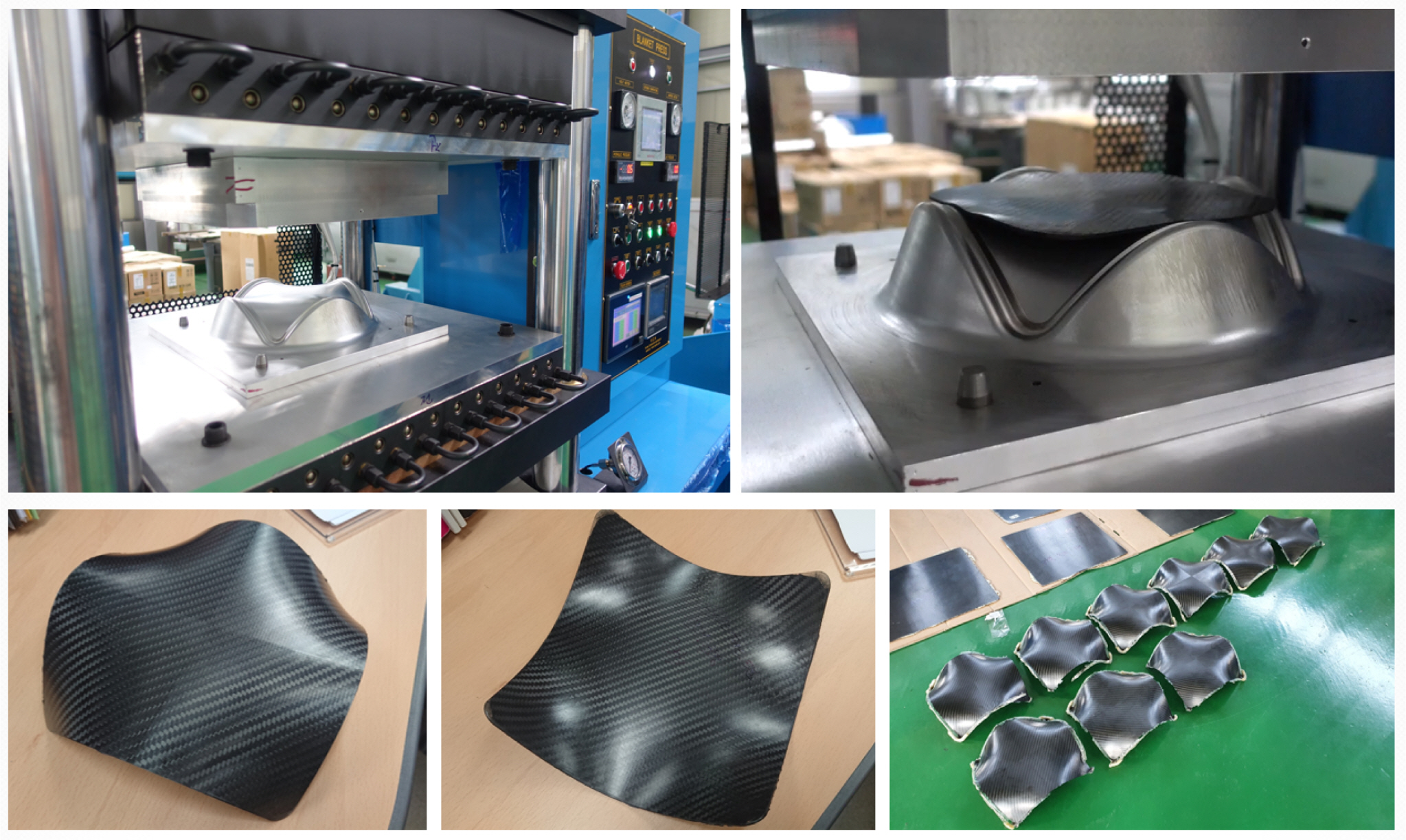 프리폼의 크기는 300 × 300 mm이며 자동 절단 장치를 이용하여 프리프레그를 절단한 후 0° 방향으로 7겹 적층하였다. 이렇게 적층된 프리프레그는 자체 제작된 프레스 금형에 투입되어 예열과 동시에 성형된다.