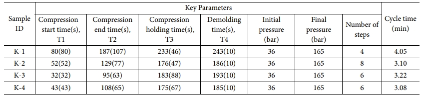 프레스 압력을 단계별로 올리면서 최종압력에 도달하기 까지의 시간은 Fig. 9와 같이 ‘T2, Compression end time’으로 결정하였고 프레스의 압력과 온도가 유지되는 시간을 ‘T3, Compression holding time’으로 결정하였다. 탈형 시간은 ‘T4, Demolding time’으로 동일하게 10초로 적용하였다. 그리고 이 시간의 합은 PCM 공정의 사이클타임이 된다.