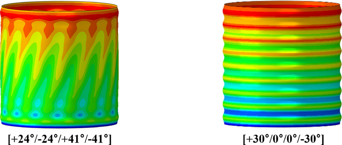 그러나, 복합재 원통 구조는 금속재 원통 구조와 달리, 기하학적 형상(두께비 및 세장비)이 동일하더라도 적층 각 및 적층 순서와 같은 적층 조건(lay-up condition)에 따라 다른 좌굴 하중을 갖는다[19]. 또한, Fig. 2의 초기 결함이 없는 복합재 원통 구조의 전역 좌굴이 발생하기 이전의 거동인, pre-buckling 단계에서의 타원(ellipse) 및 링(ring) 패턴의 변형 형상의 예시와 같이, 복합재 원통 구조의 적층 조건에 의한 pre-buckling 변형 형상이 좌굴 하중의 감소와 동반하는 좌굴 파형에 대한 영향을 끼치며, 이러한 pre-buckling 거동에 따라 기하학적 혹은 하중 불균일에 대한 서로 다른 민감도를 갖는다[18]. 따라서, 복합재 원통 구조의 좌굴 설계 시, 적층 조건(lay-up condition) 혹은 pre-buckling 패턴에 대하여, 적절한 기하학적 혹은 하중 불균일 모델에 대한 비선형 후좌굴 해석을 이용한 심도 있는 좌굴 Knockdown factor의 도출 연구가 필요하다.