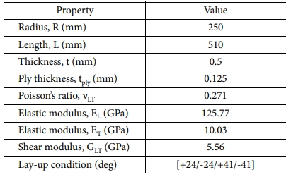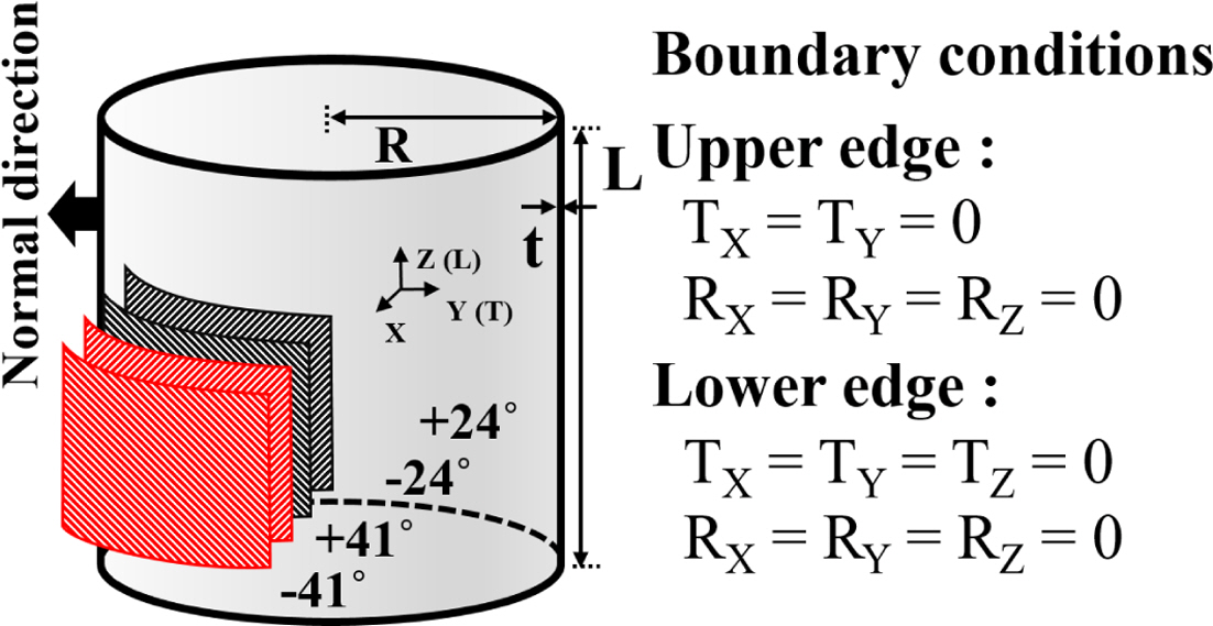 본 연구에서는 압축력에 대하여 초기 결함이 없는 완벽한 복합재 원통 구조의 좌굴 하중((Ncr)perfect)이 최대값을 갖기 위하여 최적 설계된 DLR의 Z07 복합재 원통 구조[20]를 연구 모델로 선정하였다. Fig. 3 및 Table 1에 Z07 복합재 원통 구조(두께비(R/t)=500 및 세장비(L/R)=2.04)의 제원, 경계 조건, 및 재료 물성치를 나타내었다. ABAQUS의 4절점의 쉘 요소(S4R)를 이용하여 복합재 원통 구조의 유한요소 모델을 구축하였으며, 적층판의 섬유 방향은 원통 구조의 Z축의 길이 방향을 기준으로 정의하였다. 적층 순서는 원통 구조의 안쪽에서 바깥쪽으로 적층하였다. 유한요소의 크기는 선형 좌굴 해석의 좌굴 하중의 수렴을 통하여 5.6 mm로 선정하였다.