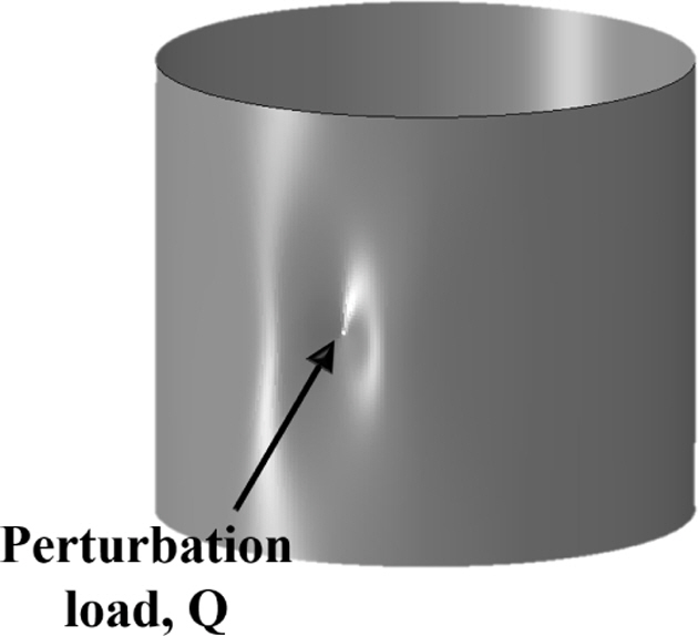 좌굴 Knockdown factor가 적용되는 원통 구조의 초기 설계 단계에서는 실제 구조물의 찍힘(dent), 불균일한 두께, 및 진원도(out of roundness)의 형상 편차와 같은 기하학적 초기 결함 혹은 우주 발사체의 단과 단 사이의 연결부에 의한 불균일한 하중의 작용 등과 같은 실제 결함 정보를 정량적으로 정의하는 것을 불가능하다. 그러므로, 본 연구에서는 SPLA[20] 및 SBPA[21]를 이용하여 얇은 복합재 원통 구조의 기하학적 혹은 하중 불균일의 초기 결함을 수치해석적으로 모델링한다. SPLA[20] 및 SBPA[21]의 초기 결함 기법은 실제 얇은 쉘 구조의 기하학적 혹은 불균일한 하중이 가해지는 초기 결함 특성을 적절히 구현할 수 있으며, 초기 결함의 모델링이 용이하여 다양한 선행 연구[8,9,12-18]에서 사용된 기법이다. Fig. 4는 원통 구조 길이의 중간에서 원의 중심 방향으로 교란 하중(perturbation load, Q)을 가하여 구현한 원통 구조의 single dimple 형상의 기하학적 초기 결함 모델(SPLA 모델)을 나타낸다. SPLA[20]의 기하학적 초기 결함 모델을 이용한 비선형 후좌굴 해석 과정은 본 연구진의 선행 연구[13-17]에 상세히 주어져 있다.