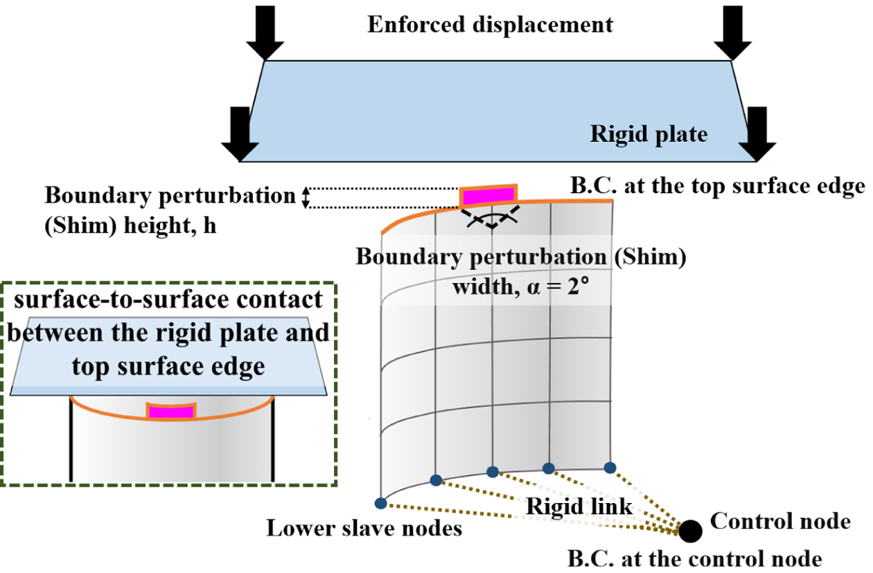 SBPA[21]를 이용한 초기 결함 모델은 single dimple 형상의 기하학적 초기 결함과 더불어 하중 불균일을 동시에 구현할 수 있다. 이를 위하여 강제 변위가 가해지는 강체 평판과 끝 단에 얇은 쉘 단편(shim)이 있는 원통이 접촉되도록 모델링한다(Fig. 5). DLR의 선행 연구[21]를 기반으로 하여, 쉘 단편의 폭은 원통의 원주 방향에 대하여 2°로 설정하였으며, 쉘 단편의 높이(h)를 증가시키면서 후좌굴 해석을 반복 수행한다. 강체 평판과 원통 상단(top surface edge)의 접촉 모델링은 ABAQUS의 surface-to-surface contact을 이용하였으며, 원통의 상단에 Fig. 3에서 주어진 경계 조건을 적용하였다. 원통 하단에는 고정 지지를 가하기 위하여, 하단에 있는 부절점(lower slave nodes)들을 원통의 중심에 있는 제어 절점(control node)에 강체 연결(rigid link)하였다. 강체 연결로 구속된 절점들은 제어 절점과 6자유도를 공유하며, 제어 절점에 경계 조건을 부여하였다.
