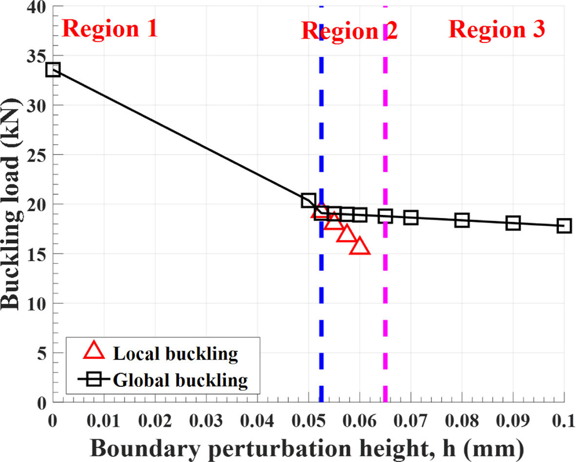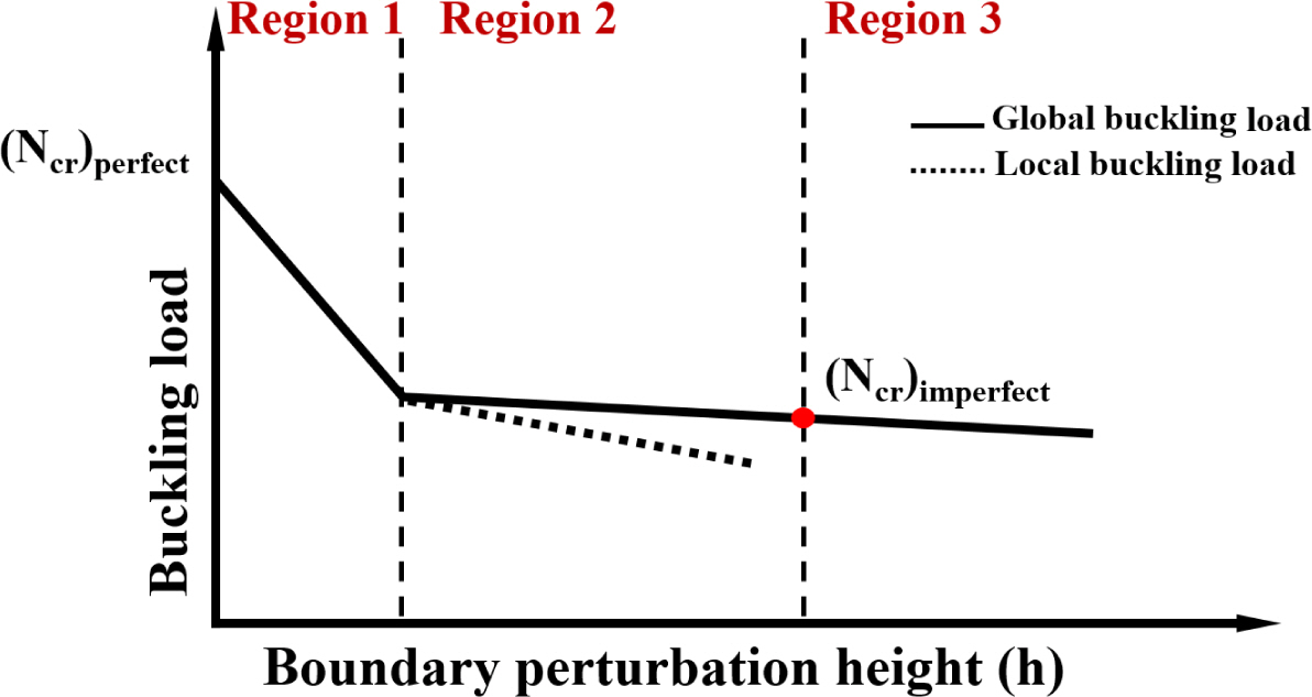 선행 연구[22]에서는 본 연구의 복합재 원통 구조 모델[20]과 동일한 적층 조건을 갖지만 세장비가 다소 작은 (L/R=2) 복합재 원통 구조에 대하여 좌굴 Knockdown factor를 도출하였으나, 좌굴 형상, 하중-변위 선도, 및 쉘 단편(shim)의 높이(h)에 따른 좌굴 거동에 대한 결과가 상세하게 제시되지 않았다. 따라서, 본 연구에서는 Z07 복합재 원통 구조[20]에 대하여 Fig. 6과 같이 초기 결함을 고려한 좌굴 거동의 특성을 상세하게 조사하기 위하여 쉘 단편의 높이(h)에 따라 하중-변위 선도 및 좌굴 형상을 3 종류의 영역(Region)으로 분류하고 그 결과를 상세하게 살펴본다. Region 1은 쉘 단편의 높이(h)가 증가하면서 전역 좌굴 하중((Ncr)imperfect)이 급격히 선형적으로 감소하는 구간이다. Region 2에서는 쉘 단편의 높이가 일정 크기보다 커지면, 국부 좌굴이 발생하고 동시에 전역 좌굴 하중((Ncr)imperfect)이 점근적으로 수렴한다. Region 3에서는 쉘 단편의 높이가 증가될 때, 비교적 완만한 스냅-스루(smooth snap-through)가 발생하며, 전역 좌굴 하중((Ncr)imperfect)만 발생하여 그 크기가 점근적으로 수렴한다. 마지막으로, Region 3에서의 수렴된 전역 좌굴 하중((Ncr)imperfect)과 식 (1)을 이용하여 좌굴 Knockdown factor를 도출한다.