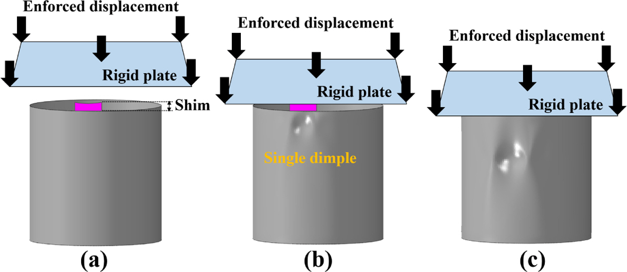 2) 강체 평판과 끝 단에 얇은 쉘 단편이 있는 원통 구조가 접촉하면서 기하학적 초기 결함(single dimple)과 불균일한 하중이 동시에 구현된다(Fig. 7(b)). 이후, 원통에 가해지는 강체 평판에 의한 강제 변위가 증가하면서, 원통 구조 끝단의 기하학적 초기 결함이 원통의 길이 방향의 중앙으로 이동함과 동시에 전역 좌굴 및 후좌굴이 발생한다(Fig. 7(c)).