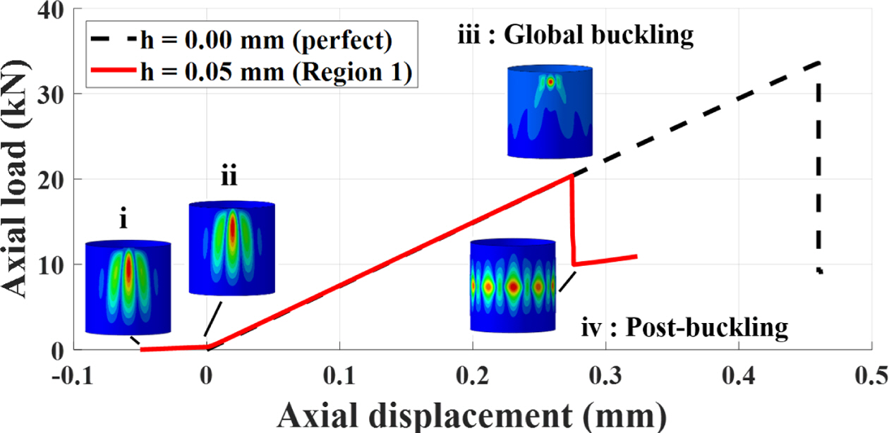 Region 1(h=0.05 mm)에서의 하중-변위 선도 및 좌굴 형상을 Fig. 8에 나타내었다. 그림에서 보이듯, 강체 평판에 강제 변위가 가해지면서, 강체 평판과 쉘 단편이 있는 원통과의 접촉이 발생한다(i). 다음으로, 강체 평판이 쉘 단편의 높이(h)만큼 원통 구조의 축 방향으로 이동하여 원통 끝 단의 상단 부와 강체 평판의 전체 접촉(full-contact)이 발생한다(ii). 이후, 축 방향의 강제 변위가 더욱 증가하면서 압축력이 증가한다(ii-iii). 축 방향의 하중이 원통 구조의 전역 좌굴 하중 크기에 도달하면, 축 방향의 강성이 급격히 감소하며 좌굴 파형이 복합재 원통 구조의 원주 방향으로 확산된다(iii-iv). Region 1에서의 전역 좌굴 하중은 20.37 kN으로 계산되었다.