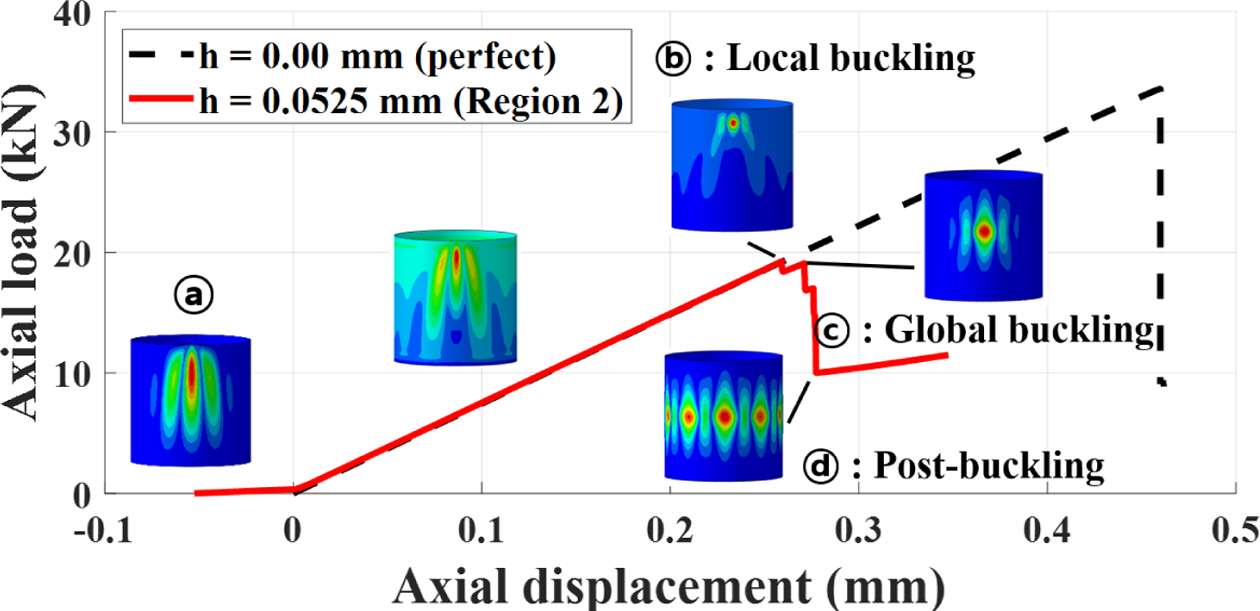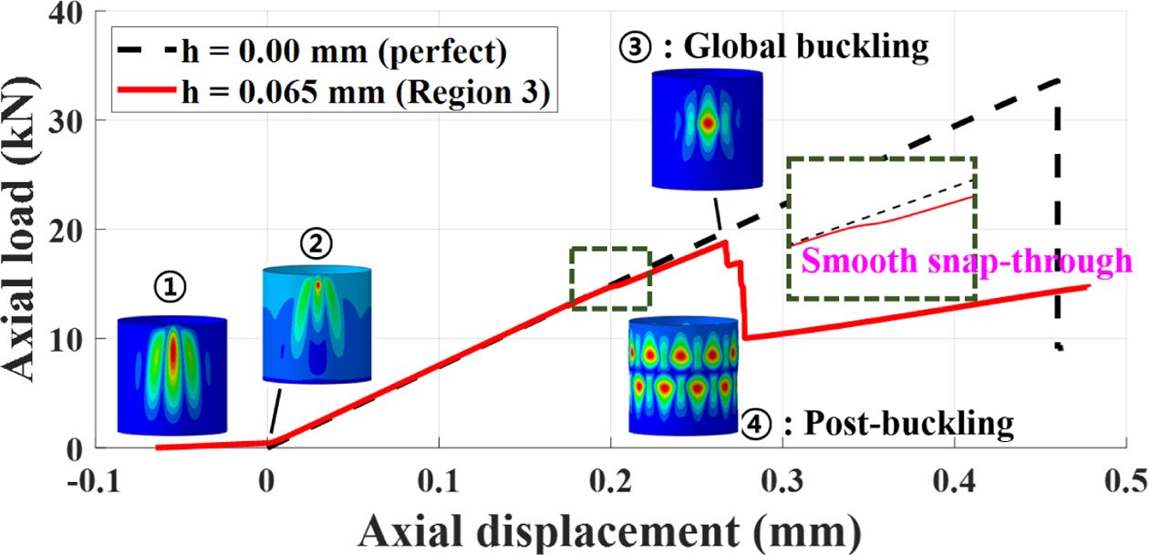 마지막으로, 좌굴 Knockdown factor 도출을 위한 초기 결함을 고려한 전역 좌굴 하중의 기준이 되는 Region 3(h=0.065 mm)의 비선형 후좌굴 해석 결과를 Fig. 10에 정리하였다. Region 3에서는 Fig. 8 및 9의 결과와 동일하게 강체 평판과 쉘 단편이 있는 원통의 접촉 거동이 발생한다 (①-②). 그러나, 국부 좌굴은 관찰되지 않으며, 비교적 완만한 스냅-스루가 발생하며, 전역 좌굴(③)만 발생하였다. 계산된 전역 좌굴 하중의 크기는 18.78 kN으로, 전역 좌굴이 발생한 이후, 원통 구조의 축 방향 강성 및 하중-지지 능력(load-carrying capacity)이 급격히 감소하며 후좌굴(④)이 발생하였다.