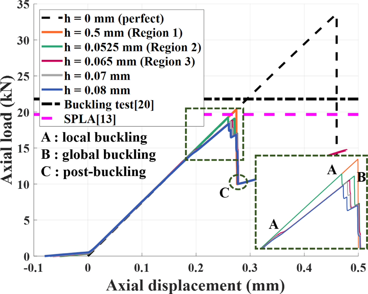 Fig. 12는 본 연구의 SBPA 모델을 이용한 하중-변위 선도를 좌굴 시험[20] 및 SPLA 모델[13]을 이용한 전역 좌굴 하중 결과와 함께 나타낸 결과이다. 초기 결함이 없는 완벽 구조의 전역 좌굴 하중((Ncr)perfect)은 33.57 kN으로 계산되었다. 주어진 그림에서도 SBPA 모델의 쉘 단편의 높이에 따른 Region 2 및 3에서의 전역 좌굴 하중의 수렴을 확인할 수 있으며, 본 연구에서는 Region 3(h=0.065 mm)의 전역 좌굴 하중(18.78 kN)을 수렴한 전역 좌굴 하중, 즉 초기 결함을 고려한 전역 좌굴 하중((Ncr)imperfect)으로 정의하였다. 좌굴 시험[20]과 SPLA 모델[13]의 전역 좌굴 하중((Ncr)imperfect)은 각각 21.80 kN 및 19.66 kN으로, SBPA 모델의 전역 좌굴 하중이 좌굴 시험[20]대비 약 14% 그리고 SPLA 모델[13]대비 약 4%만큼 낮게 즉, 보수적으로 계산되었다.