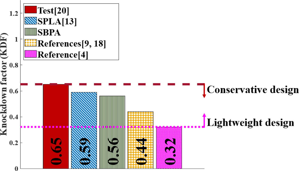 Fig. 13에 본 연구진의 SPLA 모델[13]과 SBPA 모델의 좌굴 Knockdown factor를 좌굴 시험[20], DLR에서 제안한 좌굴 Knockdown factor의 하한 값[9,18], 및 NASA의 좌굴 Knockdown factor[4]와 함께 정리하여 비교하였다. Z07 복합재 원통 구조[20]에 대하여 기하학적 초기 결함을 구현한 SPLA 모델[13]과 기하학적 초기 결함과 더불어 하중 불균일을 함께 고려한 본 논문의 SBPA 모델의 좌굴 Knockdown factor는 각각 0.59 및 0.56으로 얻어져, 좌굴 시험[20] 대비 약 9% 및 14% 낮게 계산되었다. 도출된 좌굴 Knockdown factor는 NASA의 좌굴 Knockdown factor[4]보다 모두 높은 값으로, 주어진 타원형의 pre-buckling 거동을 갖는 Z07 복합재 모델에 대하여 SPLA 및 SBPA 모델이 좌굴 시험보다 보수적인 설계의 제공이 가능하며, 동시에 NASA의 좌굴 Knockdown factor[4]에 비하여 복합재 원통 구조의 경량 구조 설계가 가능함을 알 수 있다. 또한, DLR에서 제공한 새로운 좌굴 Knockdown factor의 하한 값[9,18]에 비하여서도 여전히 SPLA 및 SBPA 모델의 좌굴 Knockdown factor가 약 34% 및 27% 높은 값으로 보다 높은 수준의 경량 설계가 가능함을 알 수 있다. 주어진 복합재 모델에 대하여서는 SPLA와 SBPA 모델의 좌굴 Knockdown factor는 매우 유사하게 얻어졌다.