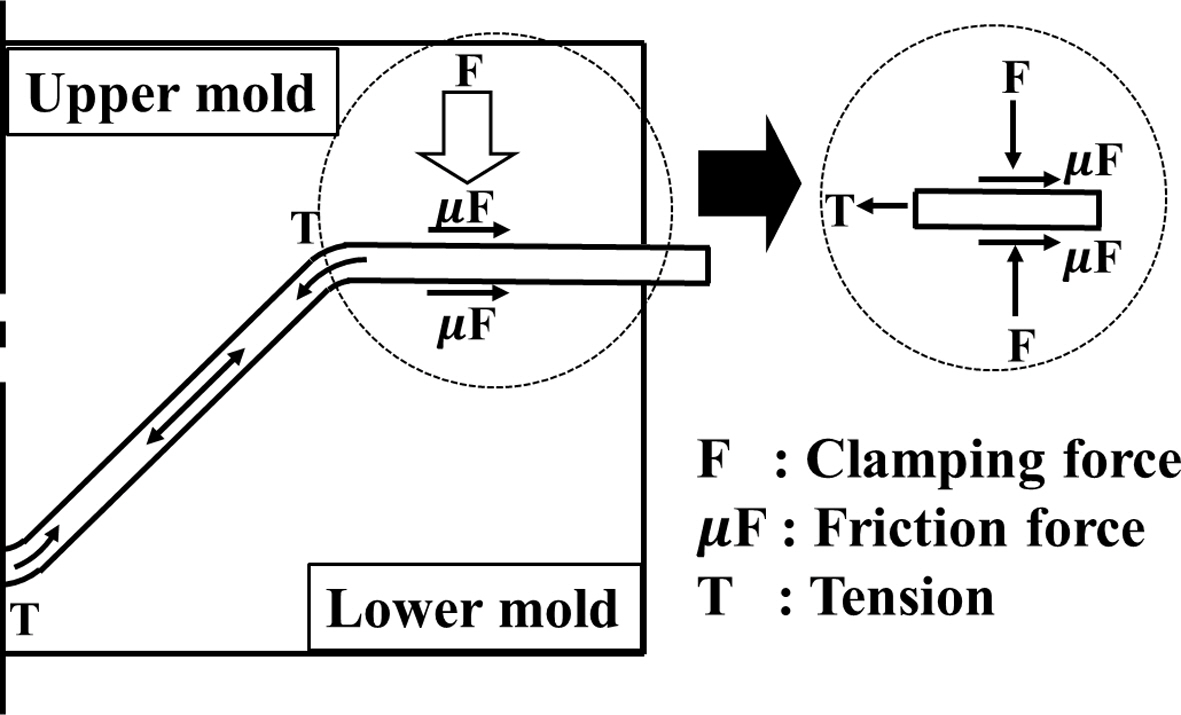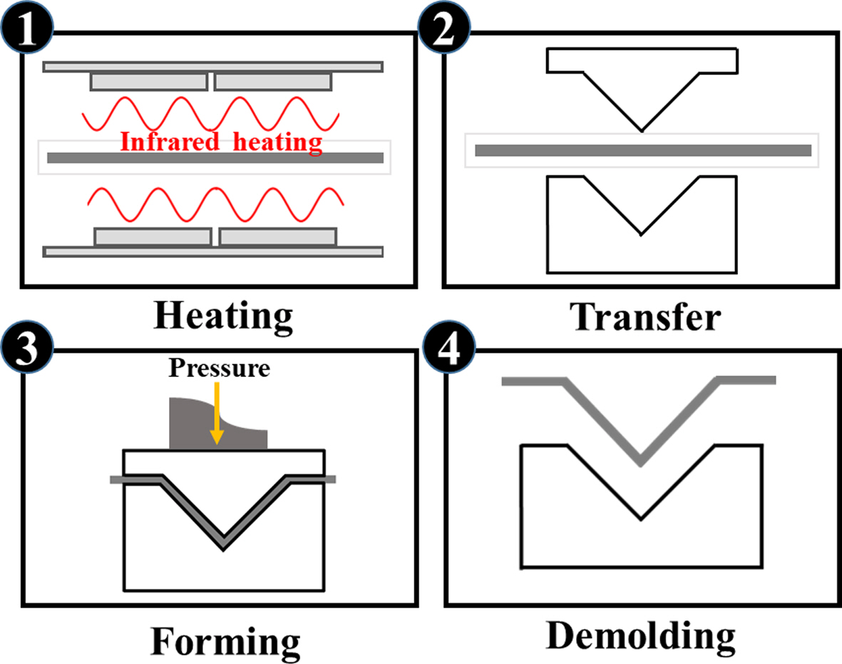 고속 열 성형 공정(Stamp forming)은 복잡한 형상의 복합재 성형이 가능한 압축 성형 계열의 공정이다[27]. 고속 열 성형 공정의 모식도는 Fig. 1에서 보인다. 비교적 짧은 공정 주기로 우수한 기계적 성능을 가지는 구조물을 만들 수 있기 때문에 고속 열 성형 공정은 열가소성 복합재 구조물을 자동화 공정으로 양산하는 데 가장 적합한 공정으로 주목받고 있다[28-31]. 이에 고속 열 성형 공정을 이용한 열가소성 복합재 성형에 대한 다양한 시도가 진행되고 있으나, 열가소성 수지의 높은 녹는점, 높은 점성은 열가소성 복합재 구조물 성형에 많은 제약을 끼친다[32-35]. 이로 인해 발생하는 금형 및 공정의 수정은 구조물 제작 비용과 시간을 매우 증가시켜 개발 기간 단축을 통한 공정 비용 절감이 요구된다[36-42].