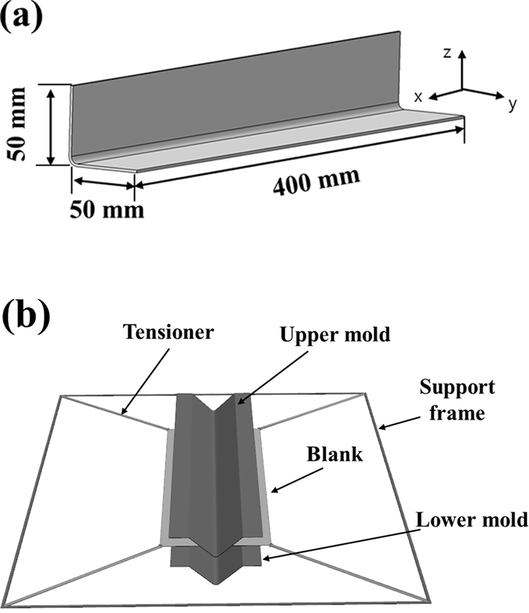 상용 유한요소해석 프로그램인 Aniform(ver. 3.6.3)을 이용하여 L-형상 구조물의 고속 열 성형 해석을 수행하였다. L-형상 구조물과 고속 열 성형 해석 유한요소 모델은 Fig. 2에 나타내었다. 유한요소 모델의 구성은 2D 요소인 trias 요소로 이루어져 있으며, 적절한 시간 증분(time step)의 설정을 위하여 블랭크의 격자 사이즈는 3 mm, 금형 격자 사이즈는 1 mm로 결정되었다. 블랭크에 장력을 적절히 유지하여 주름을 억제하도록 스프링 상수는 0.5 N/m, 스프링 초기하중은 15 N으로 입력하였다. 초기 금형 형상은 블랭크에 균일한 압력을 가할 수 있도록 설계하였다. 해석에서 금형의 열적 팽창은 고려되지 않으며, 금형으로부터 블랭크에 가해지는 압력의 크기는 21 bar이다[48]. 유한요소해석에 사용된 물성값은 Toray Cetex® TC1320AS4D PEKK의 라미네이트 물성값을 사용하였고, 기계적 물성값 및 초기 형상은 Table 1에 정리하였다[49].