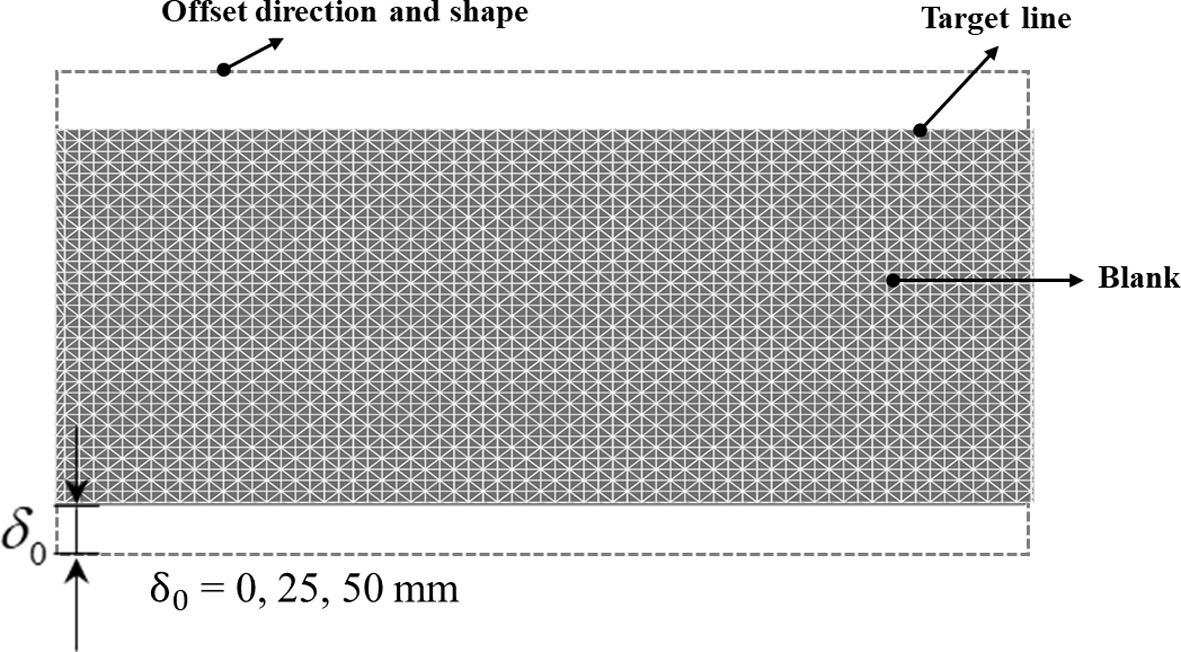 블랭크의 형상 설계는 다음 순서로 진행하였다. 우선 구조물 형상을 바탕으로 초기 블랭크 형상을 도출하고, 블랭크의 트리밍 여유를 결정하였다. 그리고 트리밍 여유에 따른 고속 열 성형 공정 영향을 분석하여 최종 형상이 결정되었다. 초기 블랭크 형상은 400 mm × 100 mm 직사각형 형상으로 정하였다. Fig. 3에서 나타낸 초기 블랭크는 설정된 블랭크의 외곽선을 나타낸 것이다. δ0의 값에 따라 트리밍 여유(δ0 = 0 mm, 25 mm, 50 mm)가 결정되며, 각각의 블랭크 형상으로 성형해석을 진행하였다.