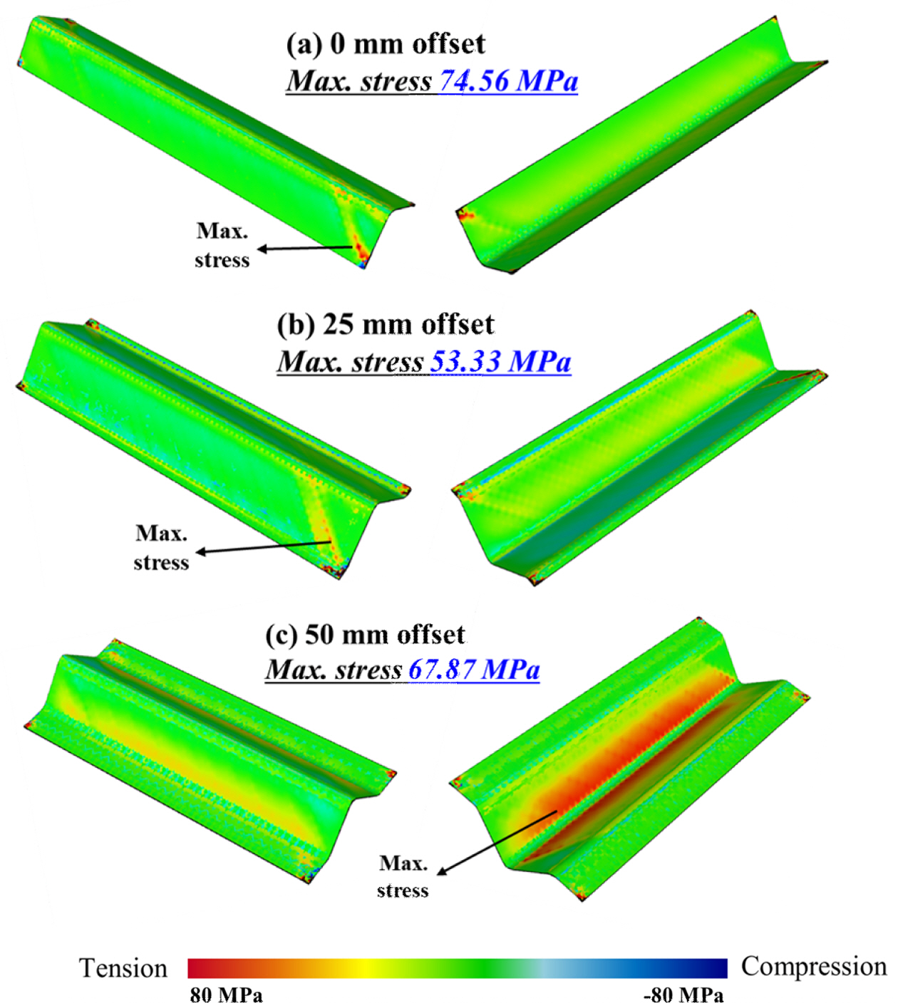 Fig. 4 Stamp forming analysis result for L-shape clip: x-direction stress; (a) δ0 = 0 mm, (b) δ0 = 25 mm, (c) δ0 = 50 mm |