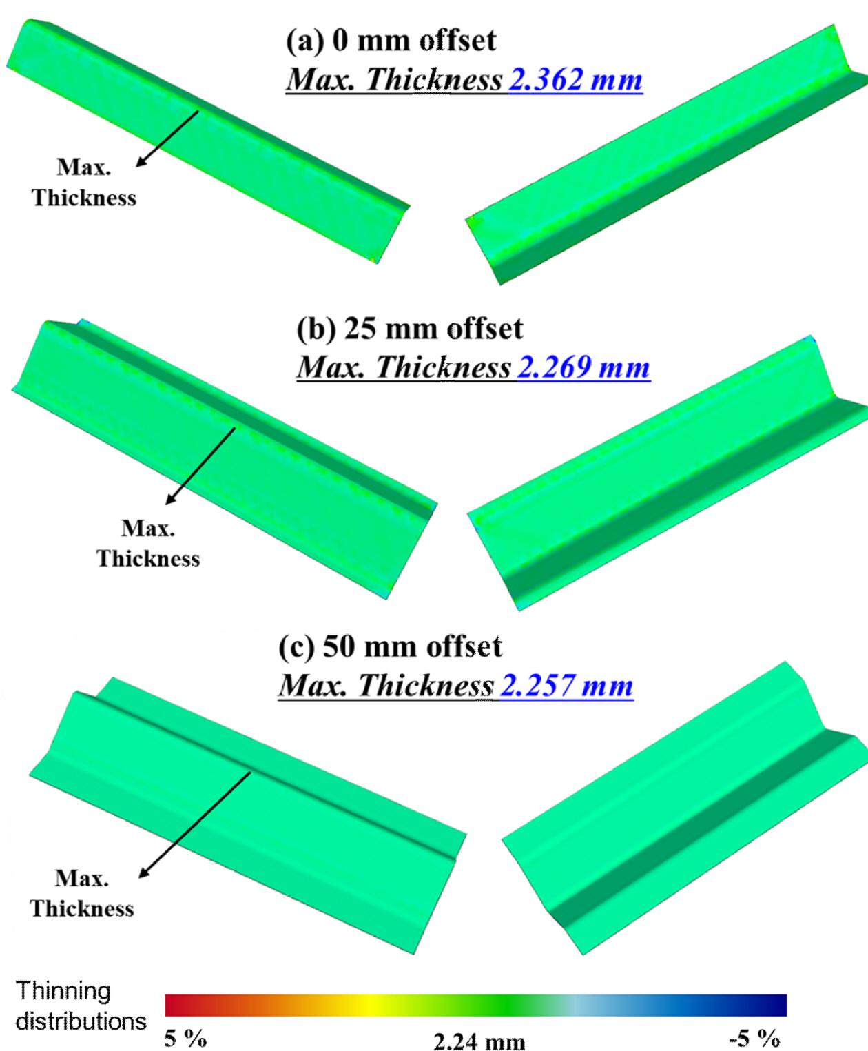 Fig. 6 tamp forming analysis result for L-shape clip: Thickness distributions; (a) δ0 = 0 mm, (b) δ0 = 25 mm, (c) δ0 = 50 mm |