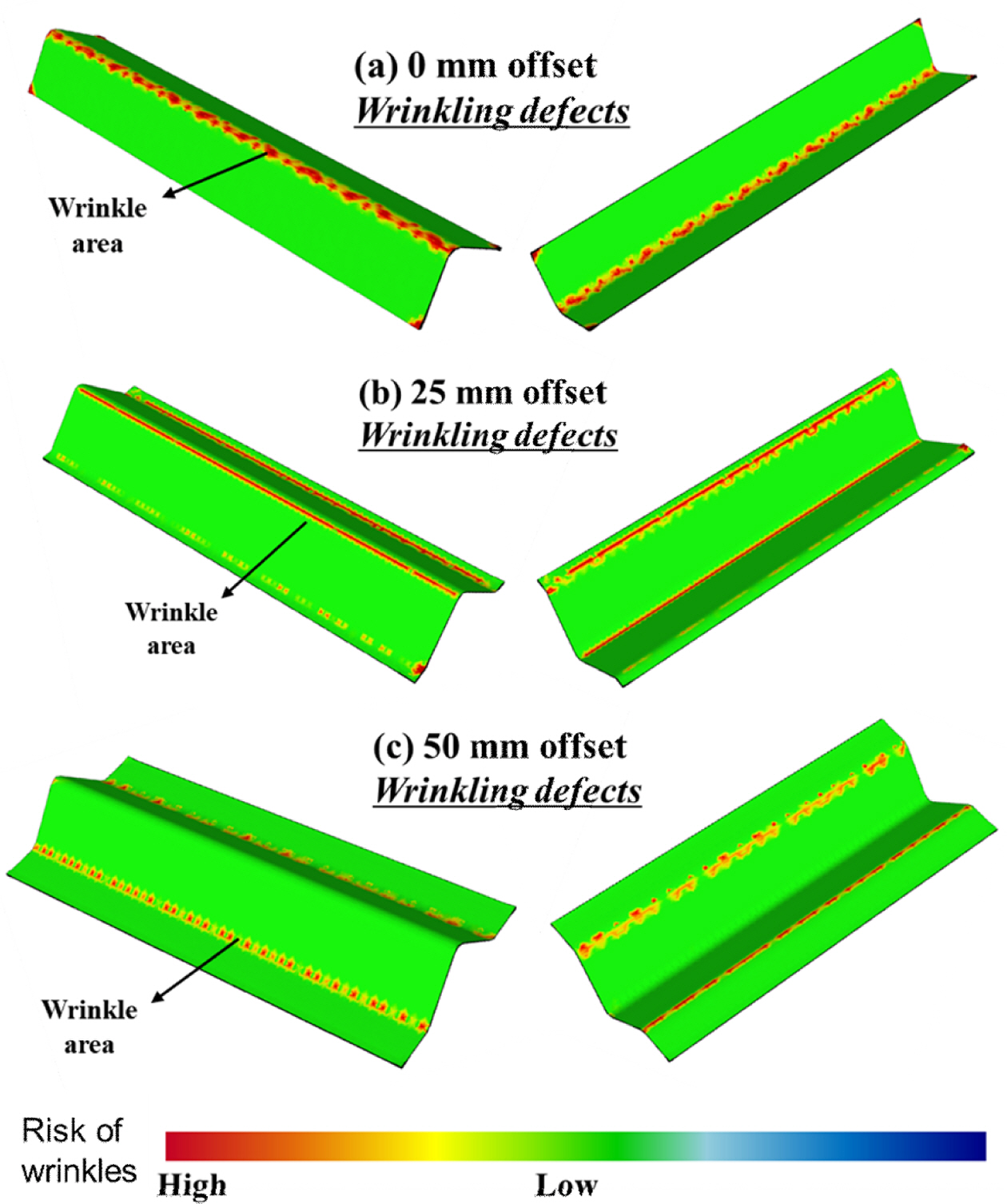 주름 해석은 유한요소해석 소프트웨어상에서 섬유의 압축 응력, 전단 응력, 두께, 굽힘 변형에 각각 1의 가중치를 두고 결과값을 평가하여 주름 발생 위험도를 알려준다. 해석 결과 모든 트리밍 여유 조건에서 곡면인 부분에 주름 확률이 높게 나타났다. Fig. 7에서와 같이 Case a, b의 경우 Case c와 달리 구조물 중심부 주름 위험도가 높게 확인되었다. 이것은 고속 열 성형 공정 중 복합재 내부에 충분한 장력이 형성되지 않아 구조물의 중심부에 주름이 발생하였다고 판단된다. Case c의 조건에서는 다른 조건들과 비교하여 주름 발생 영역이 성형 후 잘라내는 영역에서만 관찰된다. 따라서, δ0 = 50 mm의 조건에서 고속 열 성형 공정을 수행할 때 가장 우수한 성형성을 가진 구조물 제작이 가능하다고 판단하였다.