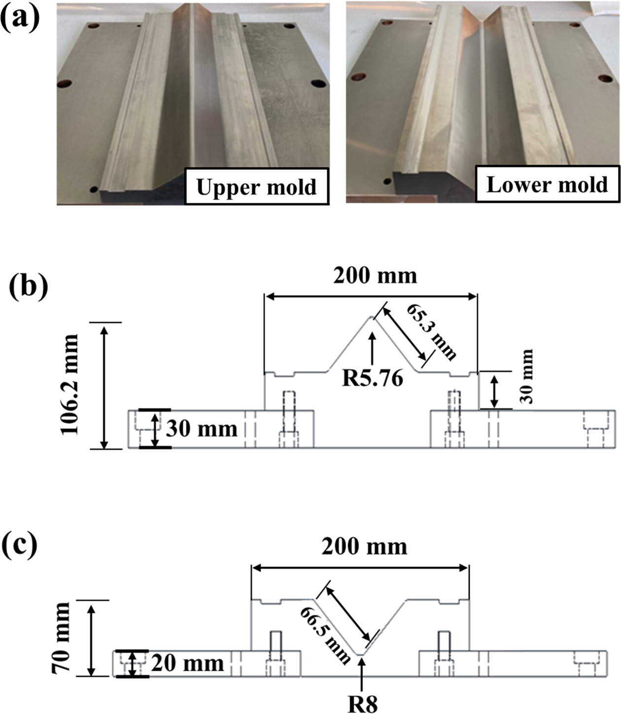 Hot press 공정을 통하여 CF/PEKK 라미네이트를 제작하였다. Toray Cetex® TC1320 AS4D PEKK를 [45/0/-45/0/90/45/-45/90]s의 적층 각도로 적층하여 라미네이트를 제작하였으며, 경화된 라미네이트의 평균 두께는 2.26 mm로 나타난다. 이후 복합재 성형 장비를 활용하여 트리밍 여유 50 mm의 블랭크 규격으로 가공하였다. 고속 열 성형 공정에 사용된 금형은 SKD11-Steel 소재로 제작되었으며, 금형의 형상은 Fig. 8에서 확인할 수 있다.