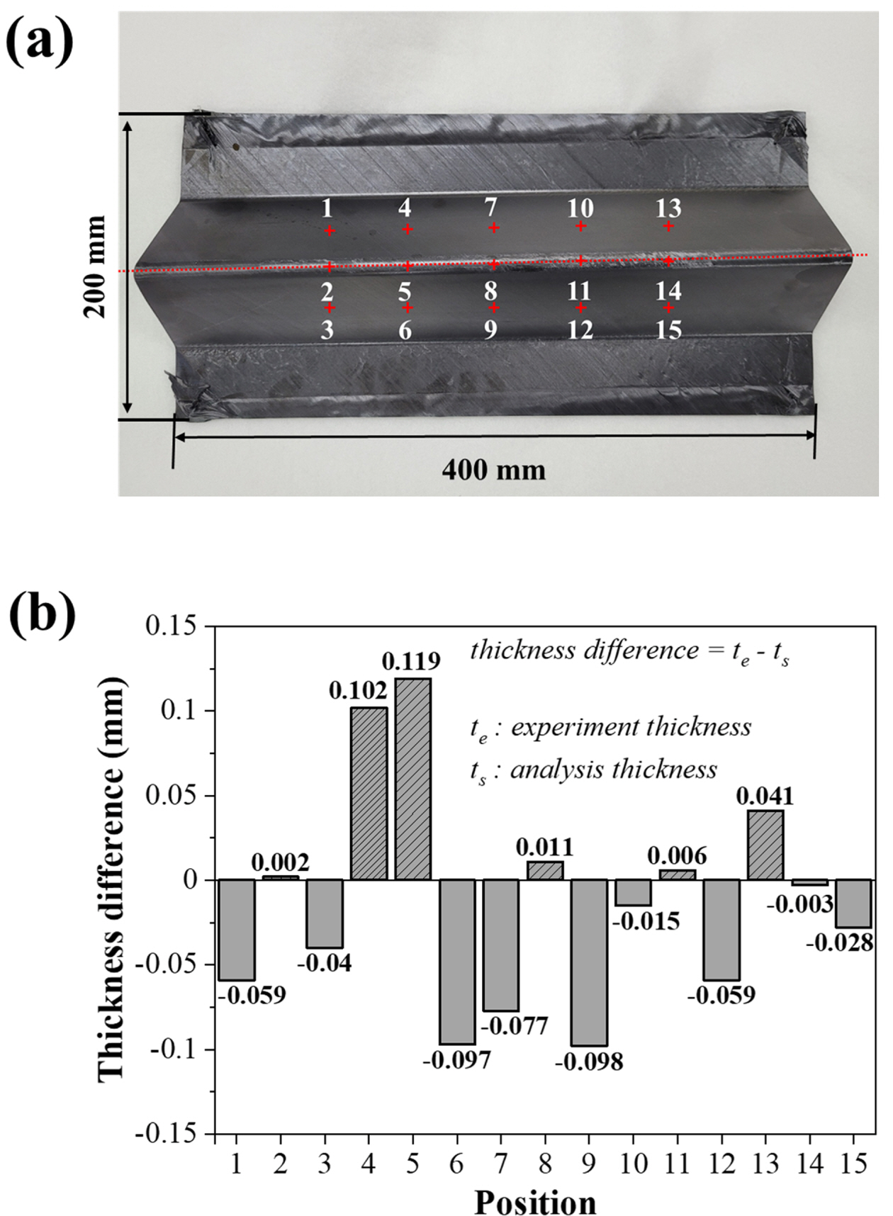 제작된 L-형상 구조물의 성형 품질을 평가하기 위해 두께 분포를 분석하였다. 구조물의 두께는 Fig. 10(a)와 같이 1부터 15까지 일정한 간격으로 선정하여 마이크로미터를 통해 측정하였다. 시뮬레이션과 실험의 두께 분포 차이는 5% 이내로 Fig. 10(b)에 나타내었다. L-형상 구조물의 중심 곡면부에 최고 두께는 2.358 mm로 나타났다. 측면 부분의 두께 차이는 4% 이내로 비교적 일정한 두께를 나타내었다. 주름의 경우 Fig. 11에서 보이는 것처럼 과도한 주름은 나타나지 않았다. 결과적으로 실험 결과는 시뮬레이션 결과와 잘 일치하며, L-형상 구조물의 고속 열 성형 해석 유한요소 모델은 실제 공정을 효과적으로 재현할 수 있다는 것을 입증한다. 특히 성형 후 불균일한 두께 분포와 주름 형성은 층간 분리로 발전 가능하며 이것은 제품의 구조 건전성에도 큰 영향을 미치기 때문에 고속 열 성형 해석 시 큰 주안점을 가져야 한다.