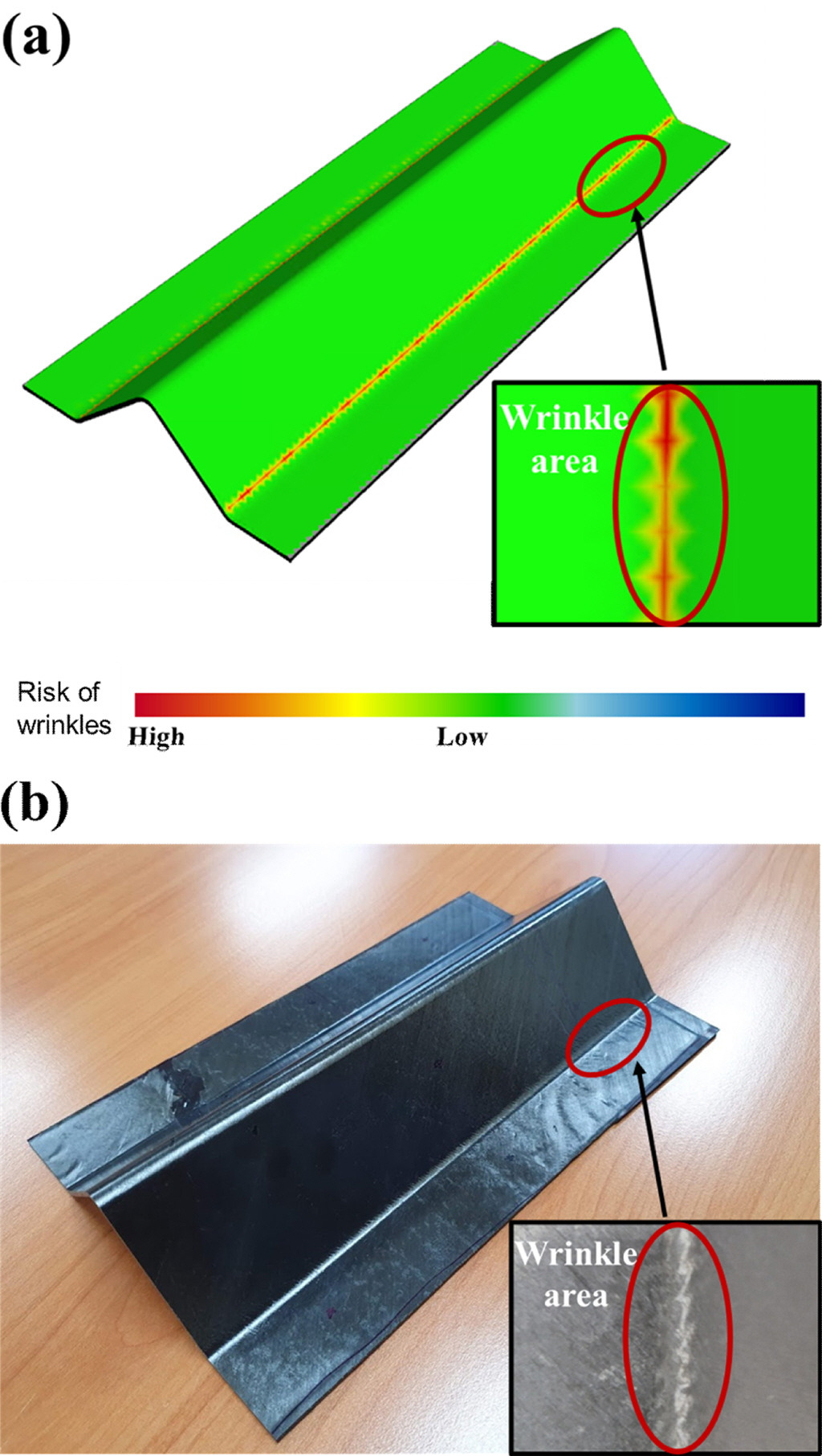Fig. 11 (a) Numerical wrinkle distribution within the L-shape clip and (b) experimental wrinkle distribution within the L-shape clip |