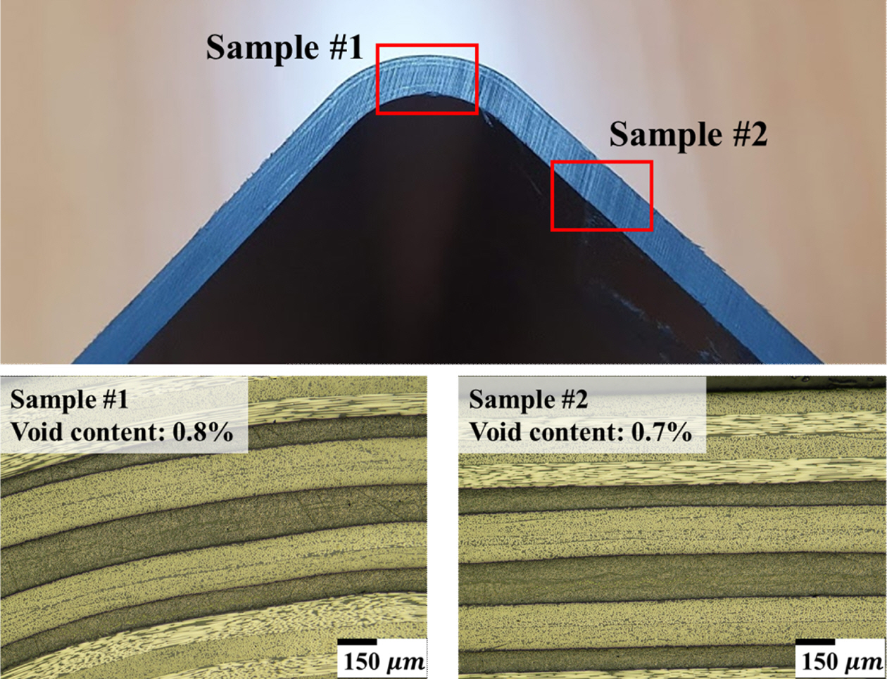본 논문에서는 주사전자현미경을 통하여 구조물의 단면을 관찰하였으며, 이미지 분석법을 통하여 기공률을 나타내었다. 현미경을 이용한 고형화된 복합재의 단면 이미지 분석은 미시 구조적 관점에서 기공의 크기, 위치 및 모양을 확인하는 방법이다. Fig. 12는 고속 열 성형 공정을 통해 제작된 L형 클립의 형상이다. 이미지 분석은 CMEIAS-IT 이미지 분석 소프트웨어를 통하여 이미지 필터링 기능을 사용하였다. 이미지 분석 결과, Sample #1의 기공률은 0.8%, Sample #2의 기공률은 0.7%로 경화가 충분히 진행된 것을 확인하였다.