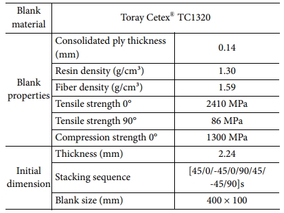 최근, 컴퓨터 성능과 유한 요소법(FEM)의 발전으로 열가소성 복합재 고속 열 성형 공정 시뮬레이션이 가능해졌으며, 이를 통해 금형 제작 등 관련 초기 비용과 시간을 절감할 수 있게 되었다[43]. Jeon 등[44]은 요소수 탱크 외장품(Urea tank cover)를 대상으로 유한요소해석 기반 공정분석을 통해 개발공정을 수행하였다. 최종 설계된 형상과 공정을 스프링 백 해석을 통해 뒤틀림 변형을 확인하였다. Hannappel 등[45]은 CF/PEEK와 GF/PPS의 성형성을 조사하였다. 성형 시뮬레이션을 통해 주름 및 내부 층간 전단 패턴을 확인하였다. Vanclooster 등[46]은 FEM 시뮬레이션을 통해 반구형 몰드에서 성형된 GF/PPS 복합재의 섬유 방향 결정을 예측하고 draping 시뮬레이션을 갖는 데 있어 유리함을 확인하였다. Luke Mosse 등[47]은 섬유 금속 라미네이트(FML)성형의 유한요소 시뮬레이션을 통해 얻은 전단 응력 값과 lap shear 장치를 사용하여 얻은 전단 응력 특성 값이 유사함을 확인하였다. 기존에 수행되었던 연구들은 다양한 성형 해석 방법을 통해 시뮬레이션의 신뢰성을 향상시켰다. 하지만 고속 열 성형 공정을 통한 일 방향(Uni-direction) 섬유 구조물 제작에 관한 연구는 미흡한 상황이다.