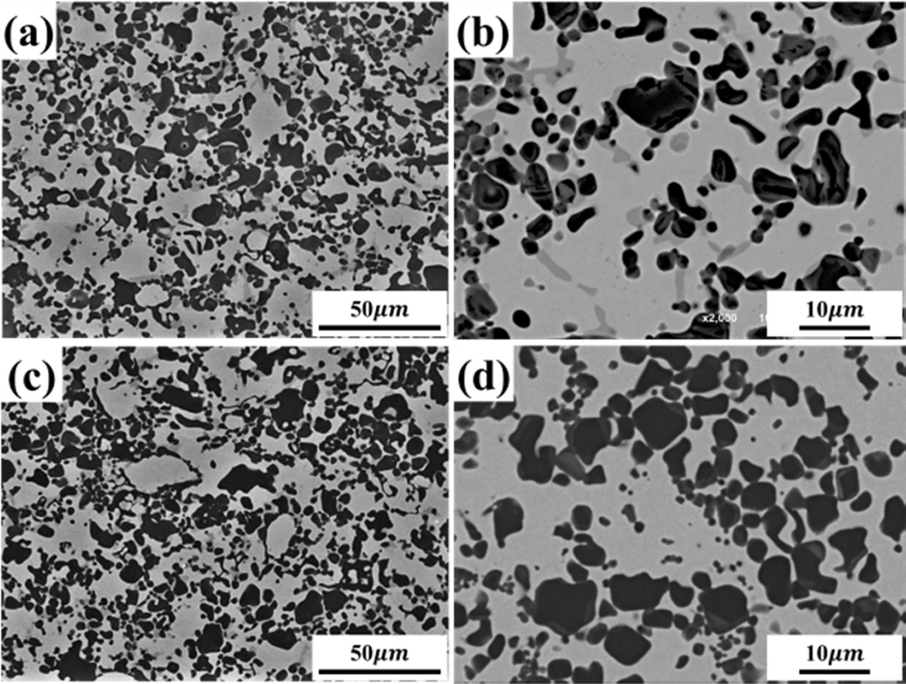 Fig. 2 Microstructure of annealed TiC/steel composites. SEM images of (a) TiC/steel(10Cr) composite, (c) TiC/steel(3Cr) composite. High resolution BSE images of (b) TiC/steel (10Cr) composite, (d) TiC/steel (3Cr) composite |