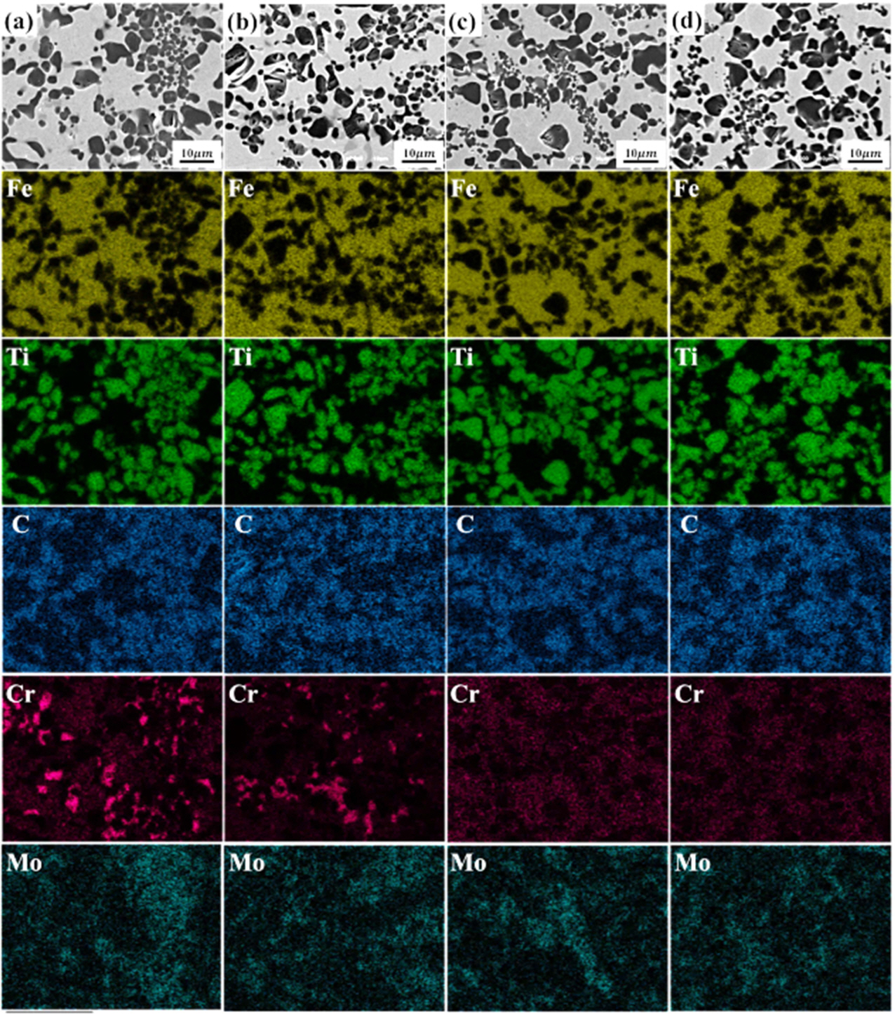 Fig. 4 SEM-EDS mapping images of etched TiC/steel composites before/after heat treatments. Compositional mapping images of TiC/steel(10Cr) composite treated by (a) annealing, (b) Q-T and TiC/steel(3Cr) composite treated by (c) annealing, (d) Q-T |