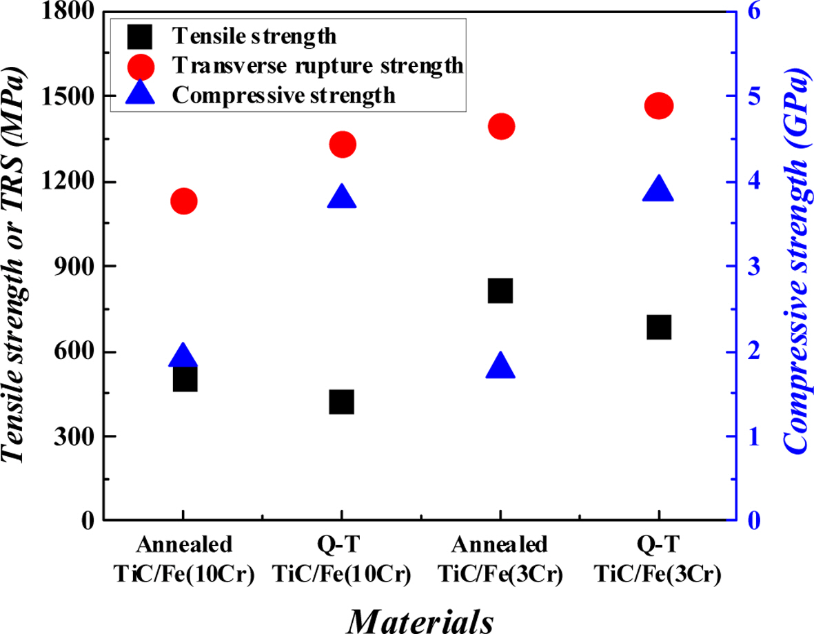 Fig. 5 Tensile strength, compressive strength and transverse rupture strength of TiC/steel composites depending on chromium content and heat treatment condition |