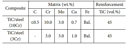 최근 기기의 고속화 및 고기능화 등에 따라 극한환경에서 적용이 가능한 소재들의 필요가 증가하고 있고, 이에 따라 단일 소재의 한계를 극복할 수 있는 복합재료에 대한 연구가 활발히 진행되고 있다[1-3]. 그 중 세라믹 입자 강화 Fe계 금속복합재료(Metal Matrix Composite; MMC)는 Fe계 합금 기지에 세라믹 강화재를 분산시켜 철강소재보다 가벼우면서도, 우수한 고온 강도, 경도, 내마모성, 내산화성 등을 가지는 소재이다. 그 중, TiC는 높은 경도(92 HRC)와 탄성율(439 GPa), 고융점(3160oC) 특성으로 인해 내마모 부품 소재로 적용되고 있으나 치밀화가 어렵고 인성이 낮아서 Ni, Fe 등의 천이 금속들과 복합재료 형태로 주로 사용되어져 왔다. 특히 Fe계 합금과는 우수한 젖음성을 가지고 복합재료 제조 시 우수한 계면을 형성하기 때문에 Fe계 금속복합재료의 강화재로 많이 사용되고 있다. 특히, 10~17 wt.% Cr을 함유하는 TiC 강화 Fe-합금기지 복합재료는 주로 공구강을 대체하기 위한 목적으로 제조되어, 내마모 또는 내부식 및 내산화 특성에 대한 연구가 주로 이루어져 왔지만[4-6], 상대적으로 구조재료로 사용되기 위한 기본 물성인 인장 및 압축강도, 항절력 등에 대한 체계적인 연구는 부족한 실정이다. 현재 분말야금 공정으로 제조된 TiC 강화 Fe-합금기지 복합재료는 압연롤, 가이드롤, 공구, 다이 및 마모부품으로 상용화되어 사용되고 있으며, 주로 Cr을 다량 함유하는 마르텐사이트계 스테인리스강이나, Mo, W 등 강화 합금원소를 첨가하여 경도를 향상시킨 금형강 및 공구강이 사용된다[5,7].